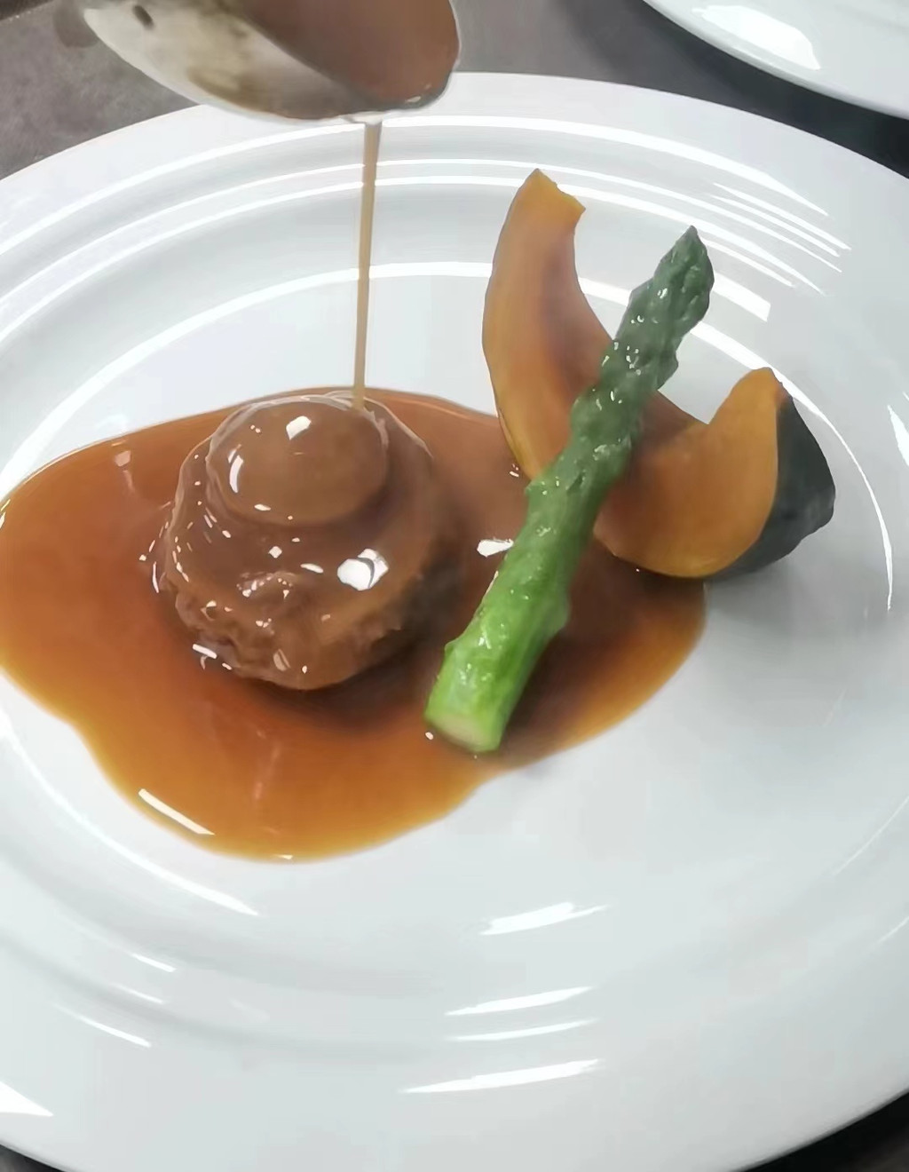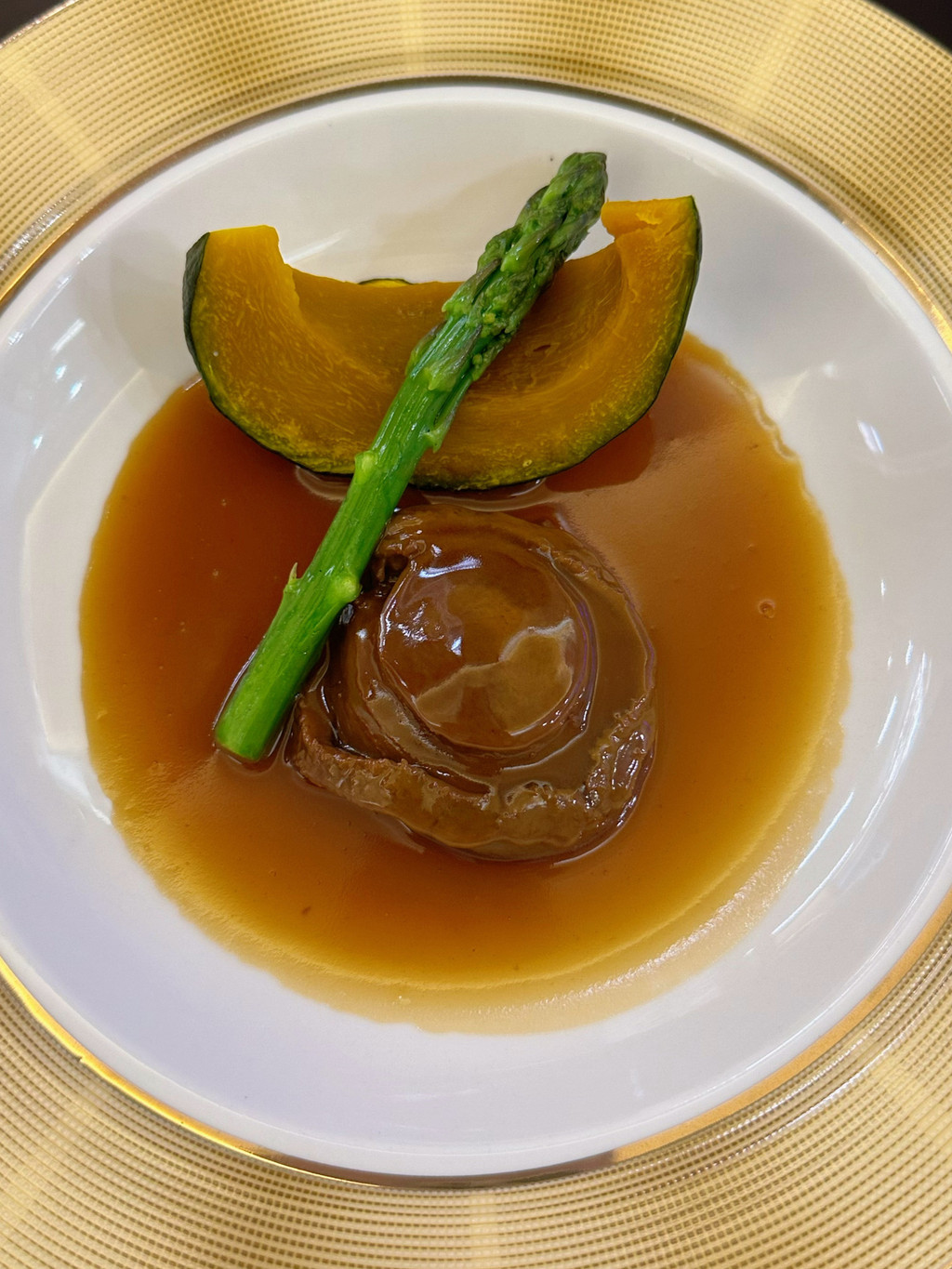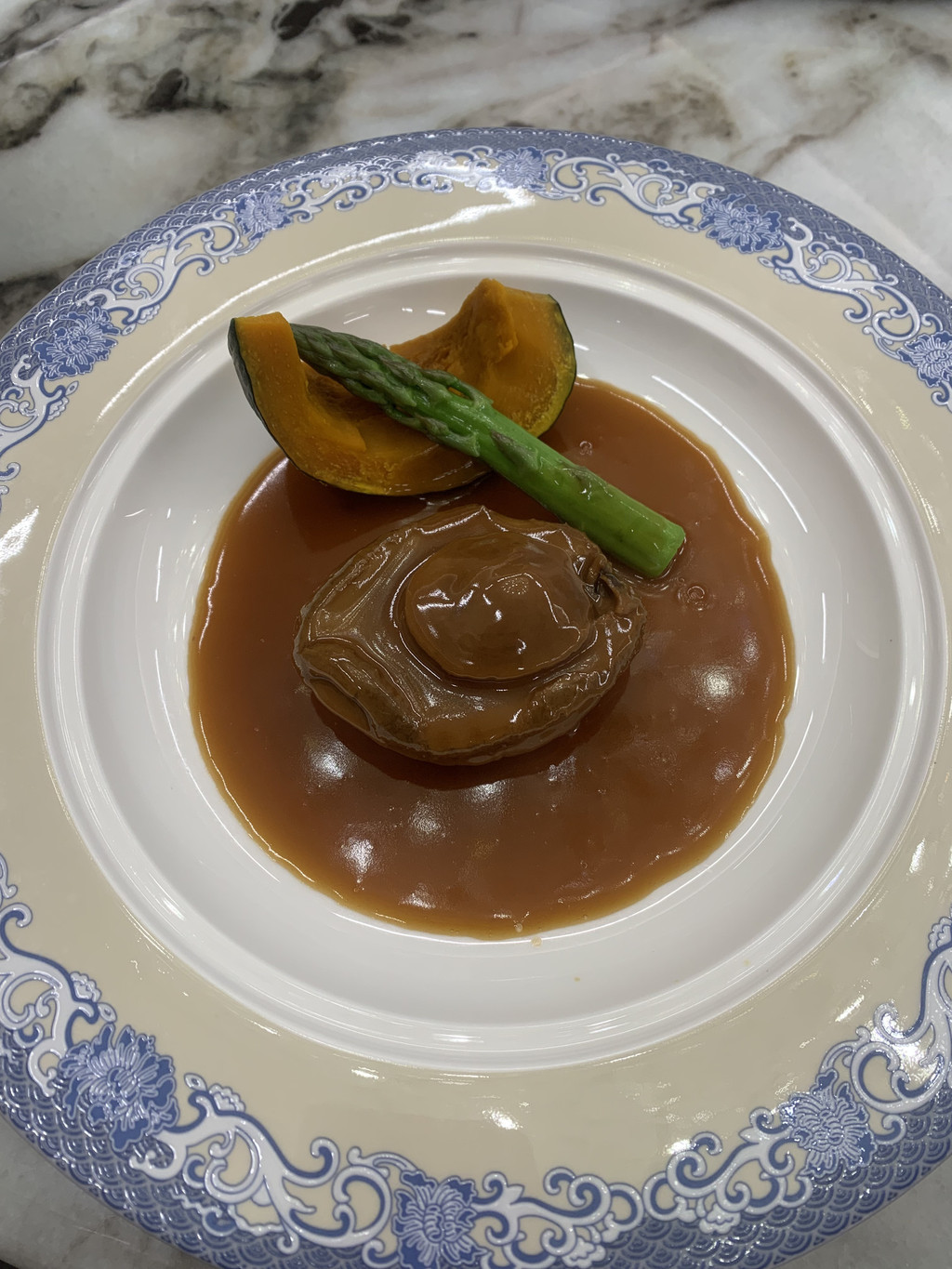 菜碟上桌,浓郁鲜香如潮水般涌来——深褐色的鲍汁莹润透亮,如陈年美酒般醇厚;正中卧着的南非干鲍饱满肥厚,表面闪着诱人的光泽,边缘微微卷起,仿佛在诉说慢火煨炖的时光故事。入口刹那,鲍鱼外层弹牙爽韧,内里却软糯粘唇,在齿间迸发出海洋的甘美与山野的醇香。而那一勺凝聚精华的鲍汁,更是点睛之笔,浓而不腻、鲜中回甘,让人忍不住想要拌上三碗米饭!