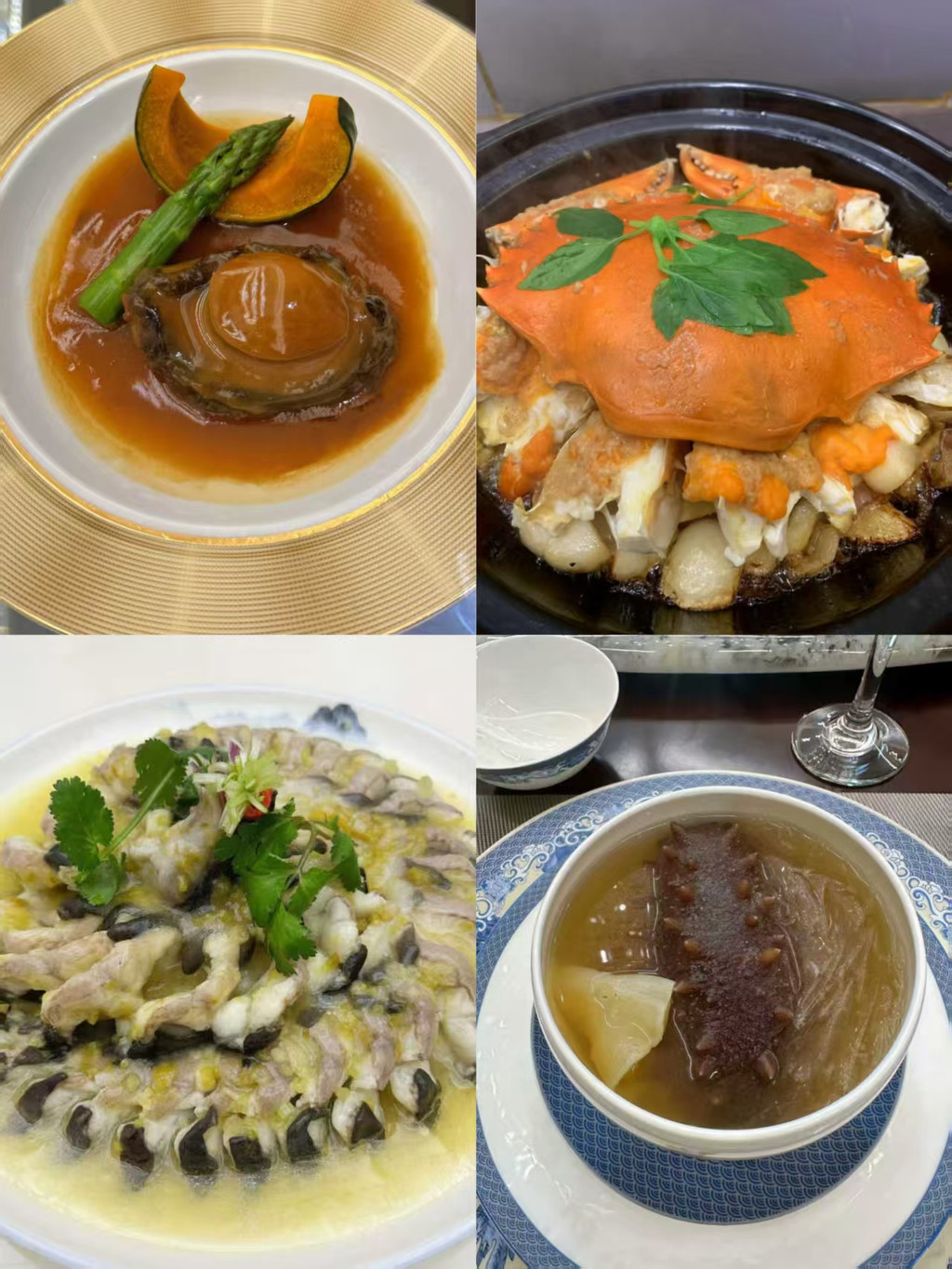 鲍汁扣鲍鱼:鲍鱼炖得软糯入味,鲍汁浓稠醇厚,拌着米饭吃,能把碗底都刮干净!旁边搭配的芦笋和南瓜,解腻又丰富了口感层次。