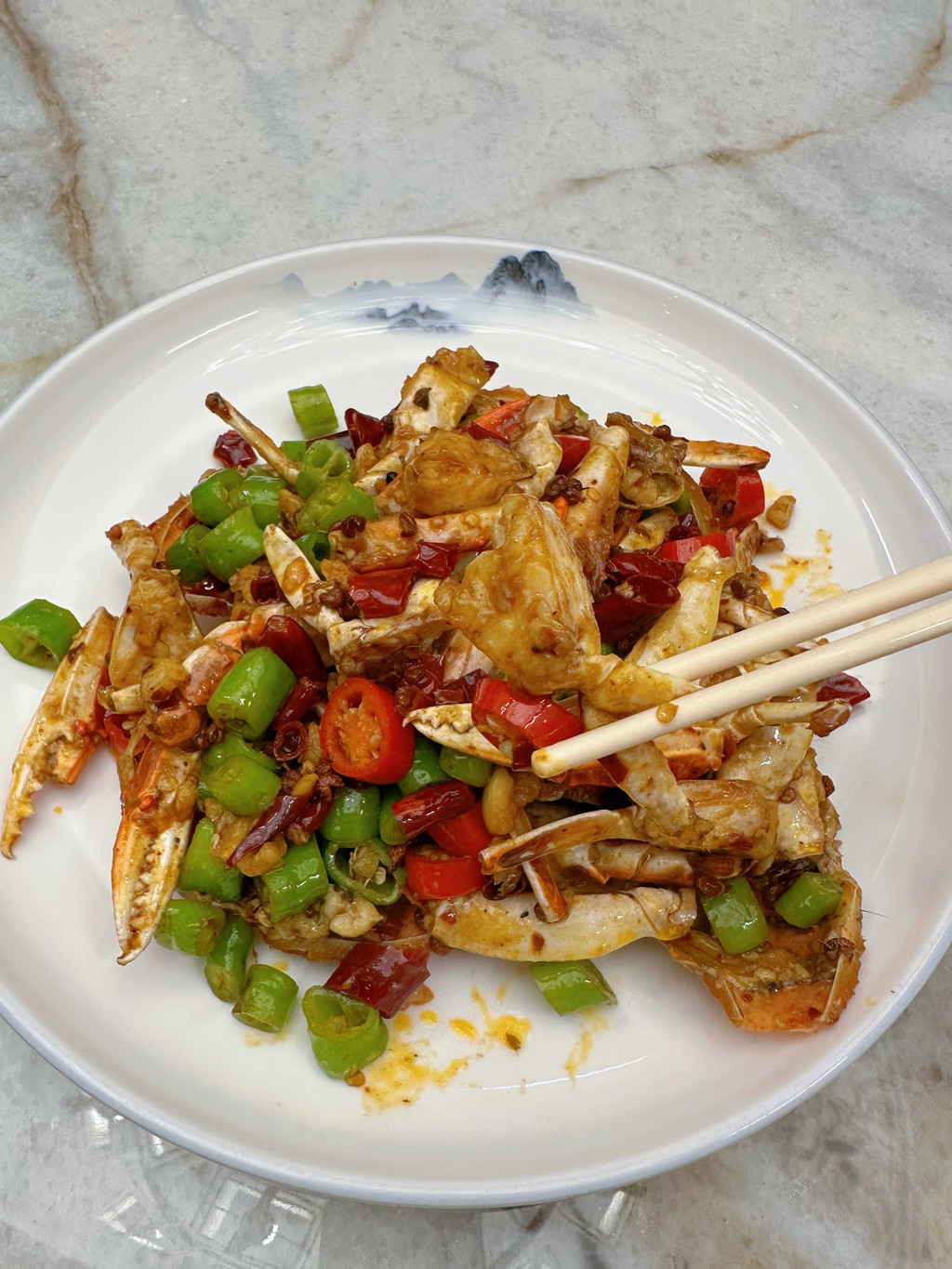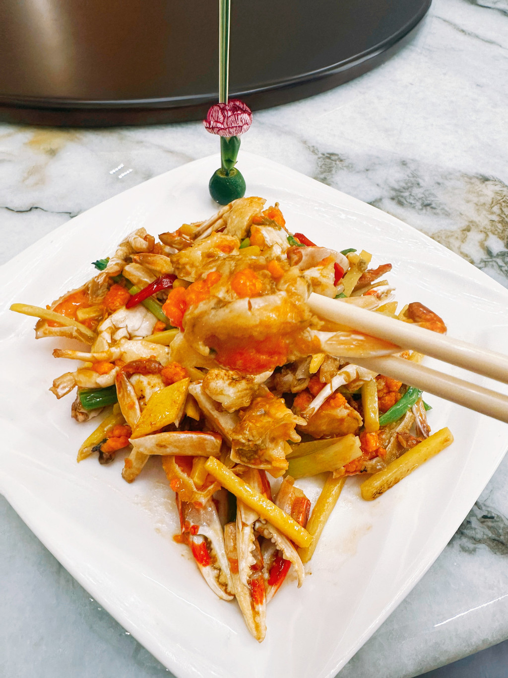 三、姜葱炒蟹:镬气十足的“潮汕烟火” 姜葱炒蟹是潮汕菜的经典,在大厨手里更是镬气满满。螃蟹切块过油,与姜葱、普宁豆酱大火快炒,葱香、姜香与蟹肉的鲜香完美融合,每一块蟹肉都吸饱了酱汁,咸香入味,带着浓浓的潮汕烟火气,吃一口就仿佛置身于汕头的老街食档,地道又解馋!