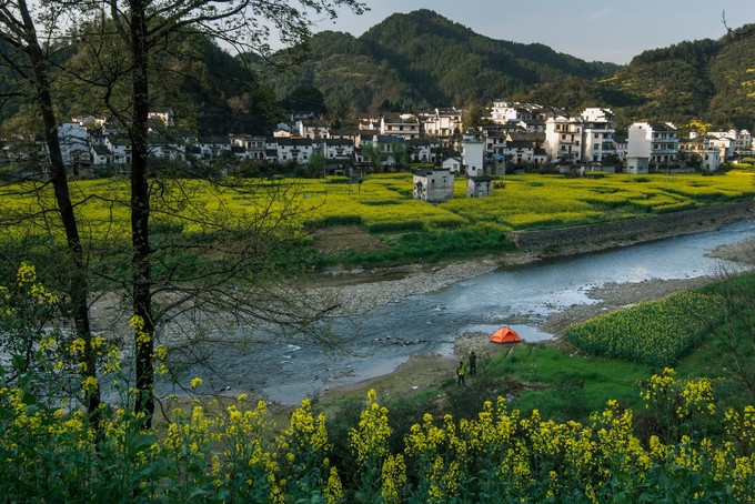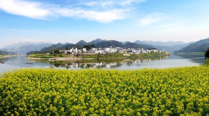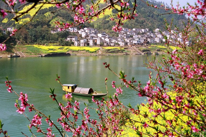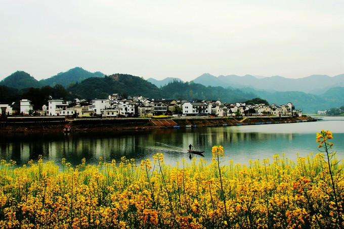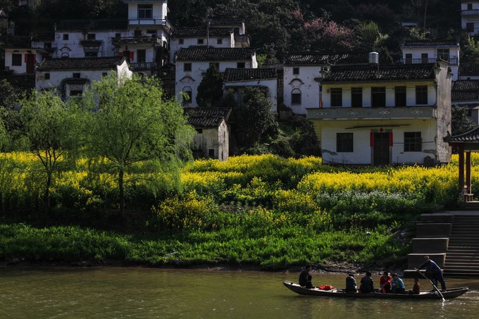 迎着清风,看两岸的徽派房屋镶嵌在山林中,看油菜花田铺天盖地的黄装点着徽派建筑,看映山红星罗棋布般点缀青山绿水,看岸上的美景倒映在水中分不清虚实,一个波浪打破这平静水面才知真假,原来人在画中游便是如此。