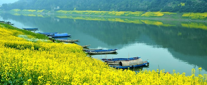 一边江水 一边花海,被春天包围的感觉舒适又惬意,一眼望去江面波光粼粼,碧绿碧绿的柳树刚吐露新芽,花香弥漫山间,溪水潺潺。