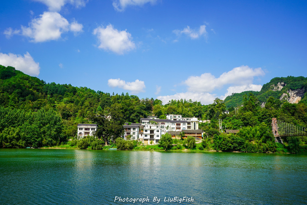 下㵲阳鬼斧神工、天然削成,河床两岸山峰耸立、悬崖峭壁、村庄错落、竹树成荫。