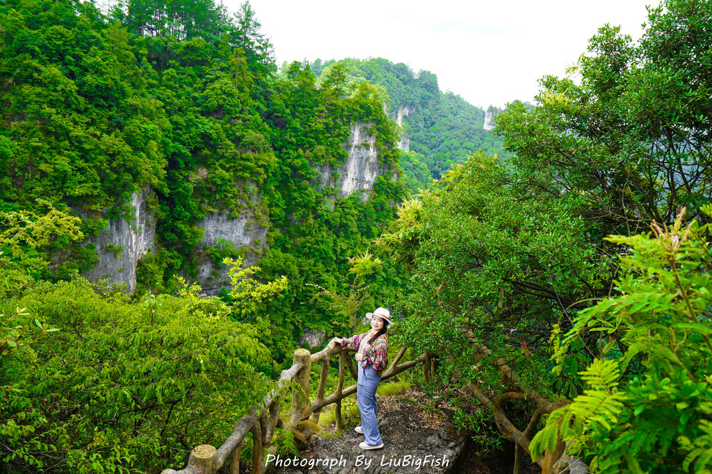 清澈晶亮的泉水,险峻嵯峨的峰丛为主体,上游群峰连绵,原始森林遮天蔽日;下游奇峰错列,危岩峭壁,古藤巨蔓络于绝壁,山泉自崖顶悬跌而落,杉木河两岸峻秀各异的山石景致。