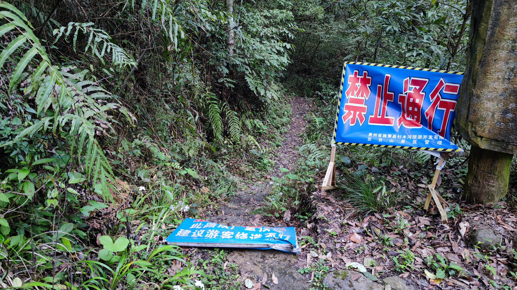 继续走红色路段,该路段两侧都挡上了,提示“禁止通行”,路上有好多倒的树,能看出来好久没人清理了,相当难走,我也是装着胆子走的,需要爬2个山。