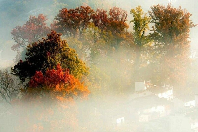 石城戴村为南宋末年创建,距今有近八百年历史,村子里翘角飞檐的古名居,粉墙黛瓦的马头墙,这个地处偏僻山的小村子颇有古徽州的所有气韵..但是对比这里的参天枫树这些徽派建筑却像极了玩具,石城的枫树高度均超38米,网友都直呼要上天了!此处曾一度被国内众多媒体评选摄影枫叶绝佳位置!每到11月中下旬,是观赏枫树最佳时节!