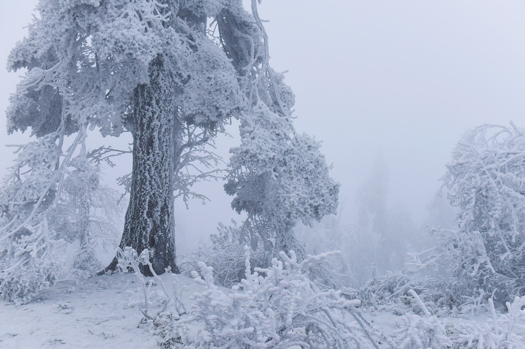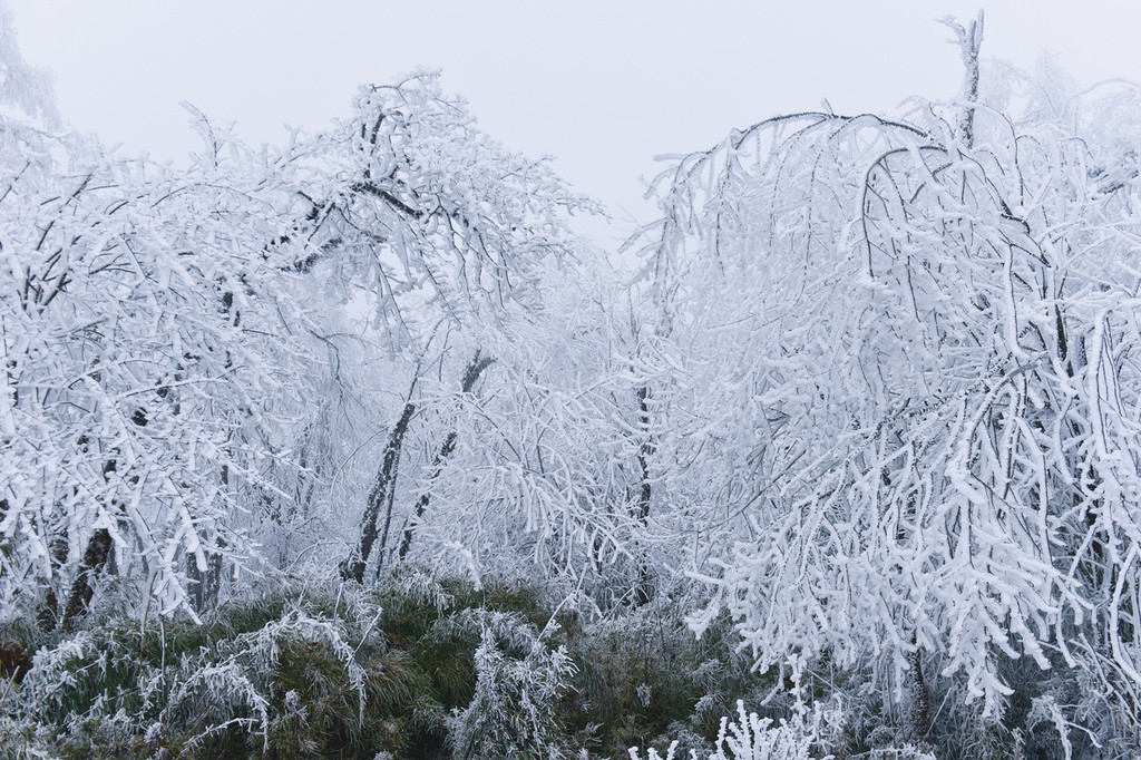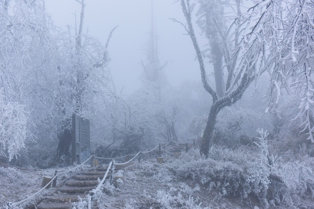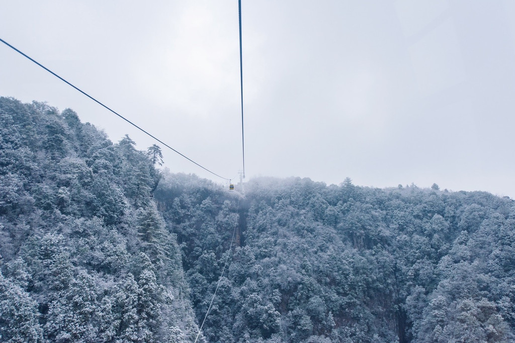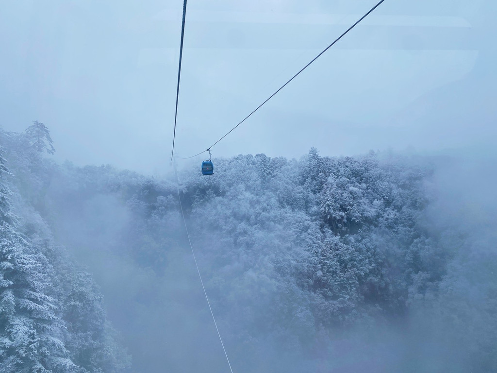 索道划过长空,穿越森白林海,不时陷入白蒙蒙的雾气之中,恰似山间云兽横行,让人捉摸不透。其下露出千丈深渊,一幕幕惊险让人胆战心惊,但却不得不为这深山雪景俯首感叹。
