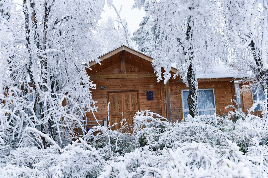 林间灌木乔木密密麻麻,大多被风雪压弯了枝头,有一些也能侥幸露出少许芳华。温暖的小木屋就躲在密林中间,顶上盖着厚厚的积雪,全靠它的纯木颜色我们能很快分辨出这隐蔽的居所,乍一看也颇具欧美风格。