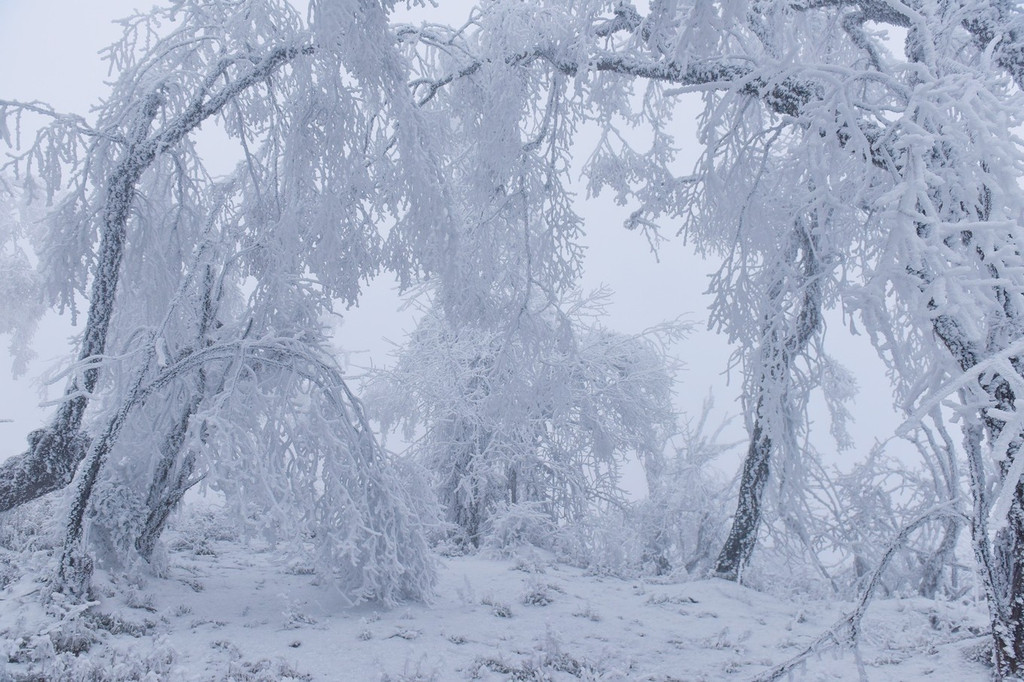 历经艰辛,扛过了严寒傲雪,白兮兮的王岗坪终于出现在我们的眼前。山谷幽闭,似有鸟兽伏鸣,不见其形,却闻其声。每一口呼吸仿佛都含着冰晶,冷得扎人,却也能感受到它的新鲜。听说这个景区是刚刚开园不久的,环境清雅,游人稀疏,此刻的我心里都洋溢着小庆幸,感觉来这儿真是值得!