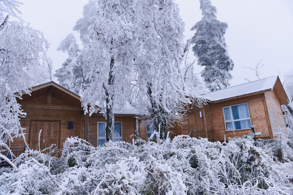小木屋挨着小木屋,冰雕树挨着冰雕树,这儿像极了童话世界的王国小天地。