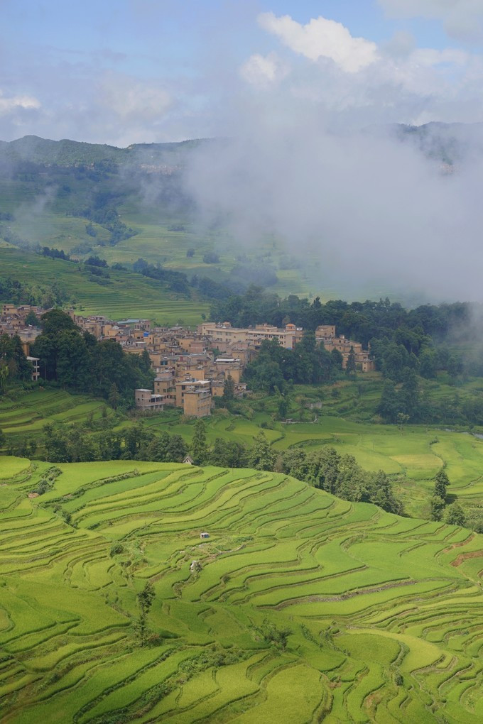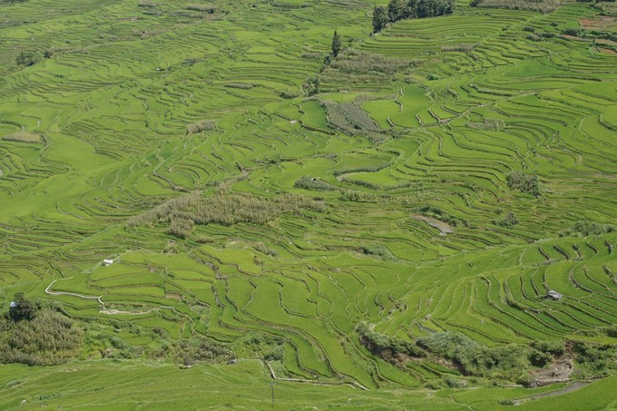 世世代代依赖于土地,农耕文明与巍峨的大山在此处相遇、碰撞,开辟了任何时候看来都让人叹为观止的自然奇观。梯田随山势地形变化,大大小小高低错落,田内种植的稻谷远望如丝绒般平整丝滑。高山峡谷之间,道法自然又不失整齐规矩,仿佛有双上帝之手将此处细细雕琢,成就了一幅巨大的艺术珍品。