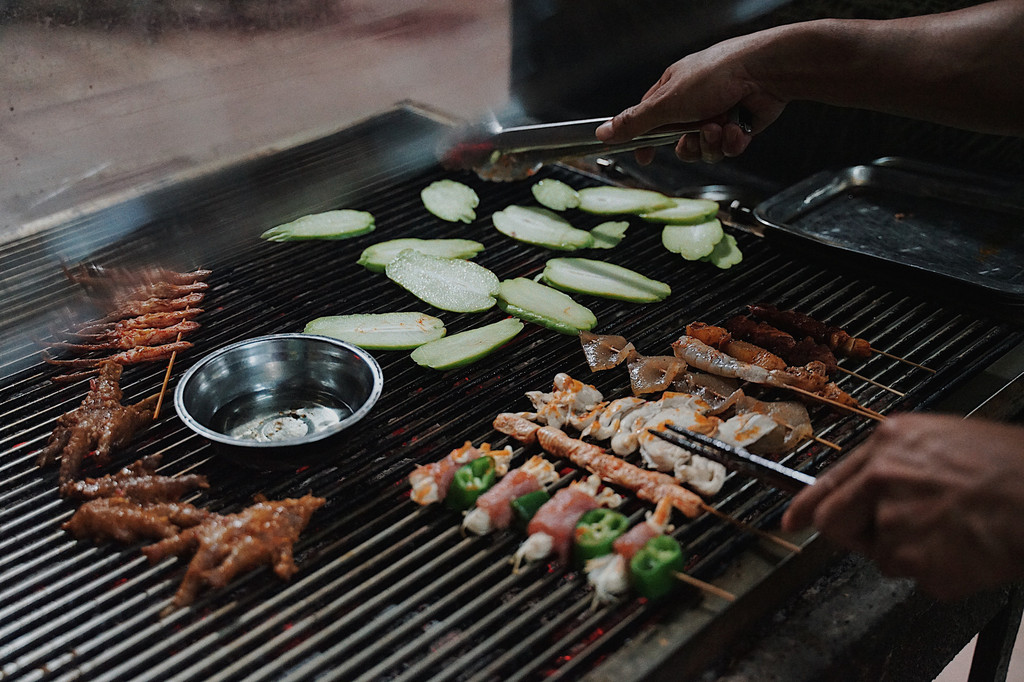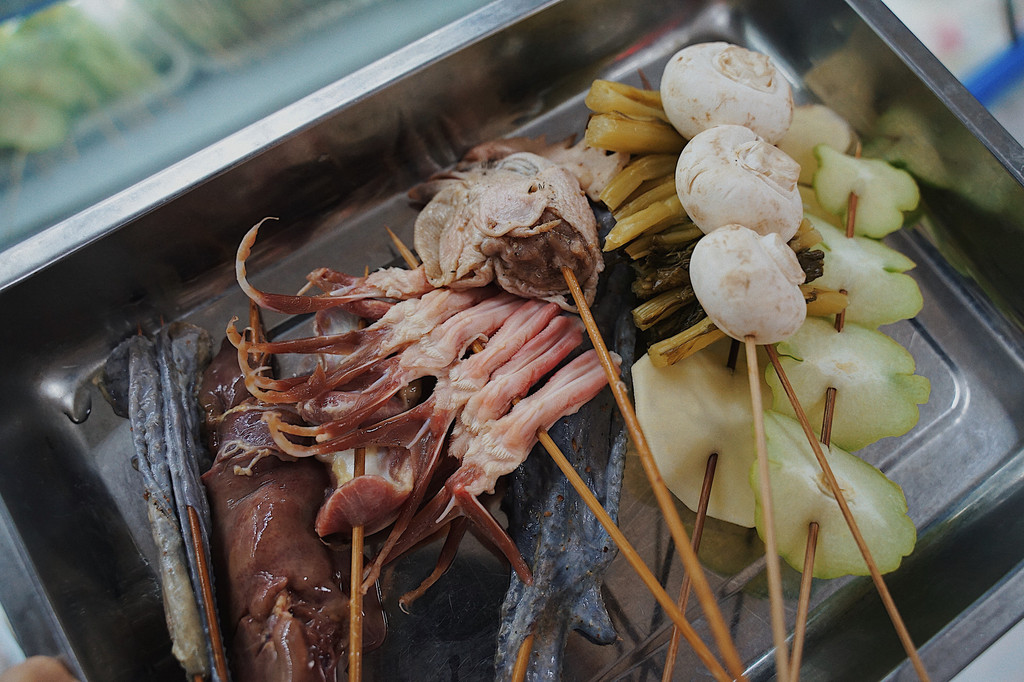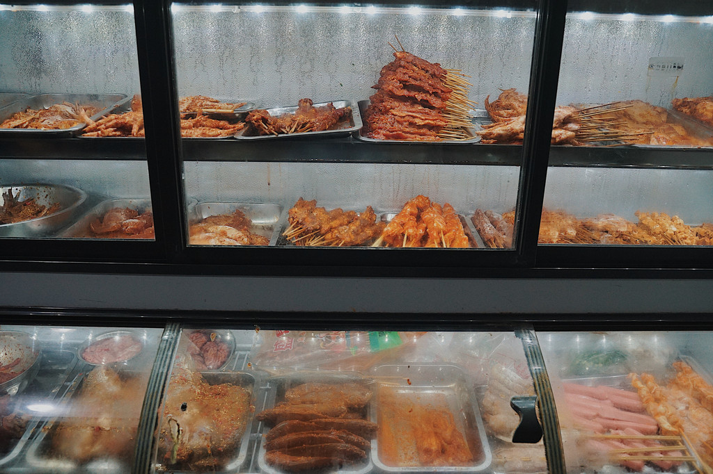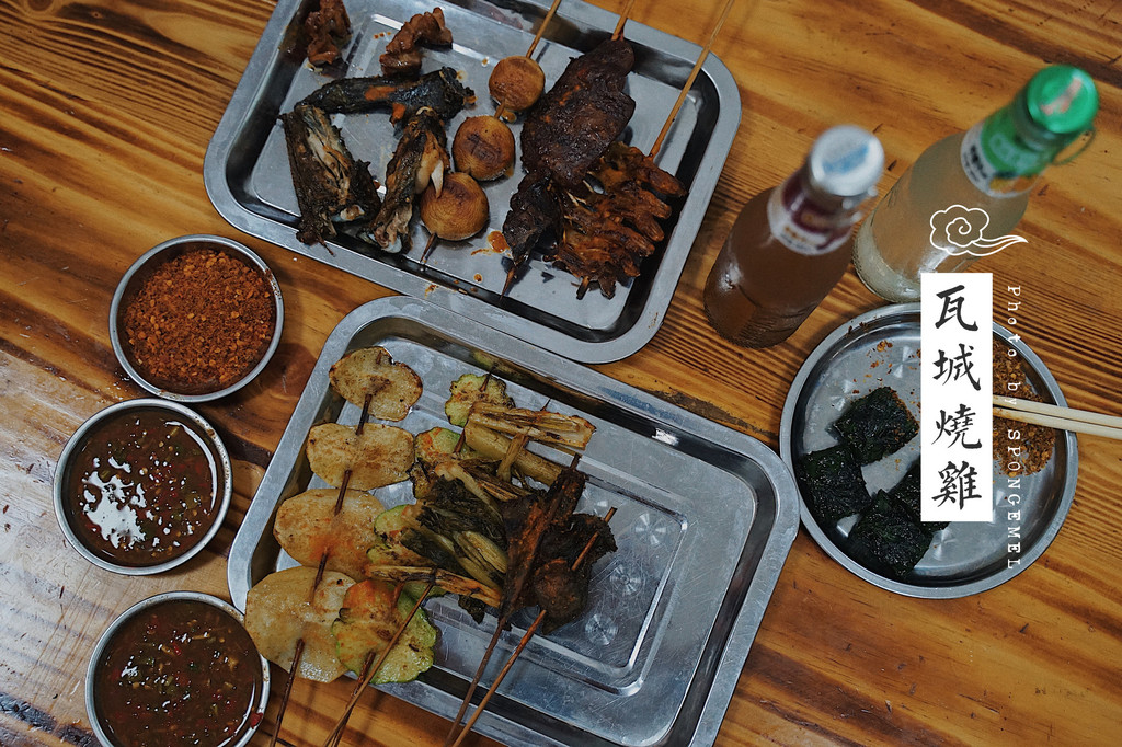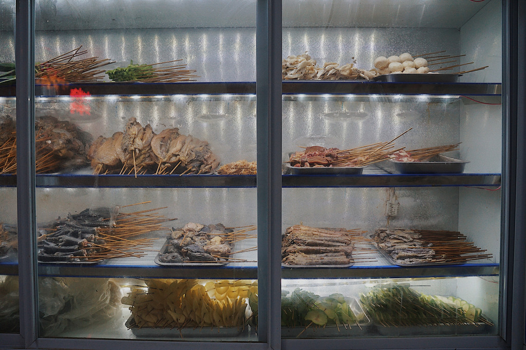 这里的烧烤店,几乎都没有菜单。所有食材悉数串好,放在冷柜里,全由食客自己挑选。每家都有自己的擅长——这家“瓦城烧鸡”,最最招牌的,便是烤乌骨鸡。乌鸡身上的各个部位:鸡翅、鸡尖、鸡皮、鸡头、鸡肝、鸡架......在老板的烤炉上,都能化为神奇的美味。