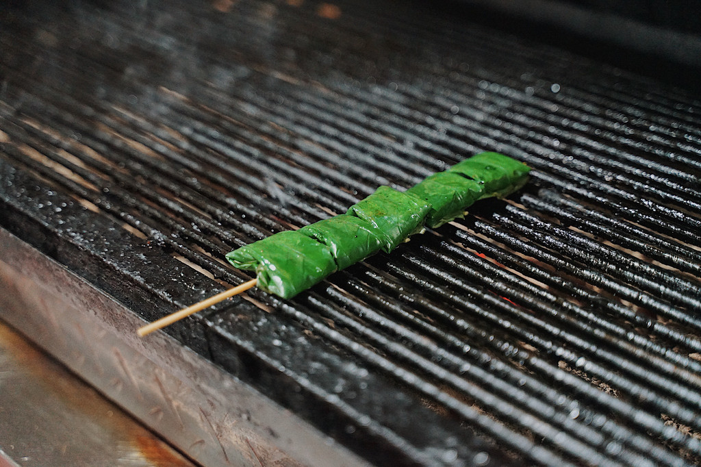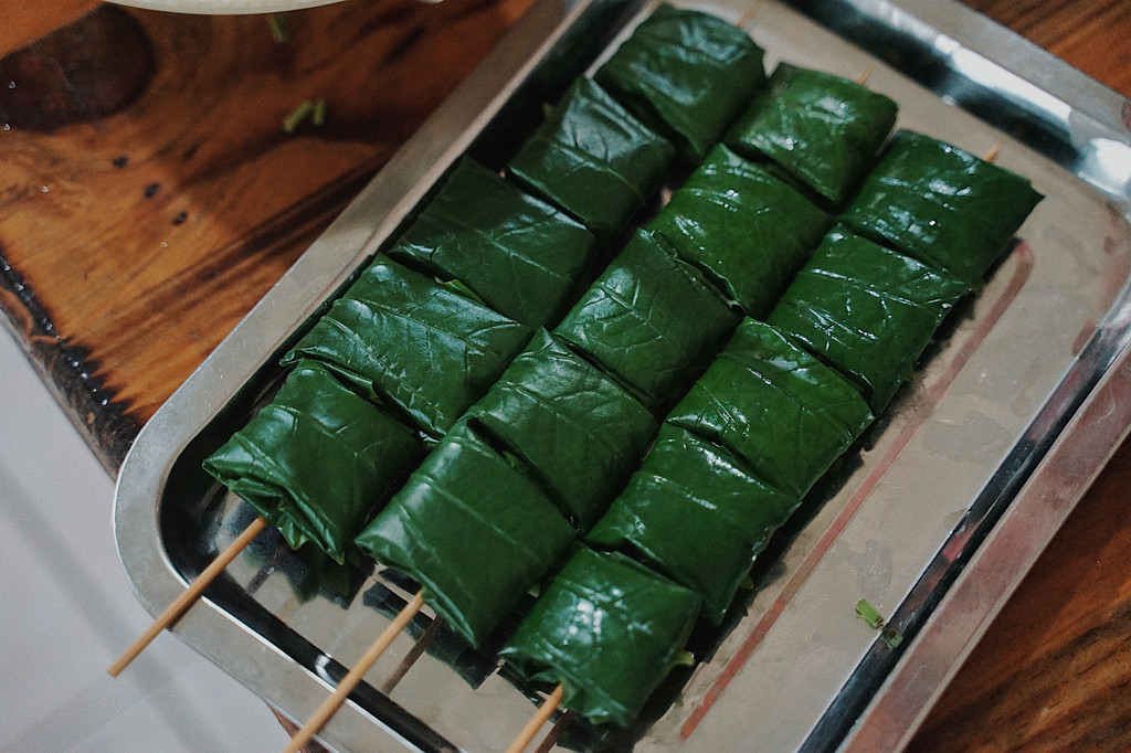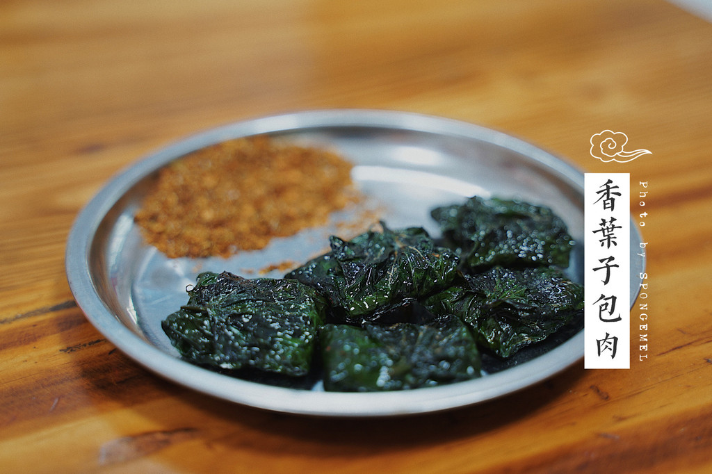 另一家邻居店“ 金平 勐拉烧烤店”,则是以勐拉傣族风格作为主打。走进店里,看到老板正在用一个绿色的叶子像折纸一样包住肉馅,然后一个一个串起来,再放到火上炙烤至叶子萎蔫。这其实是一道傣族特色菜——香叶子包肉,这种叶子傣语叫薅药啰,是一种胡椒科植物,带有天然的芳香。通常用叶子包住五花肉馅,然后炸或烤,带着叶子一起食用,会有一种难以描述的美味芬芳。