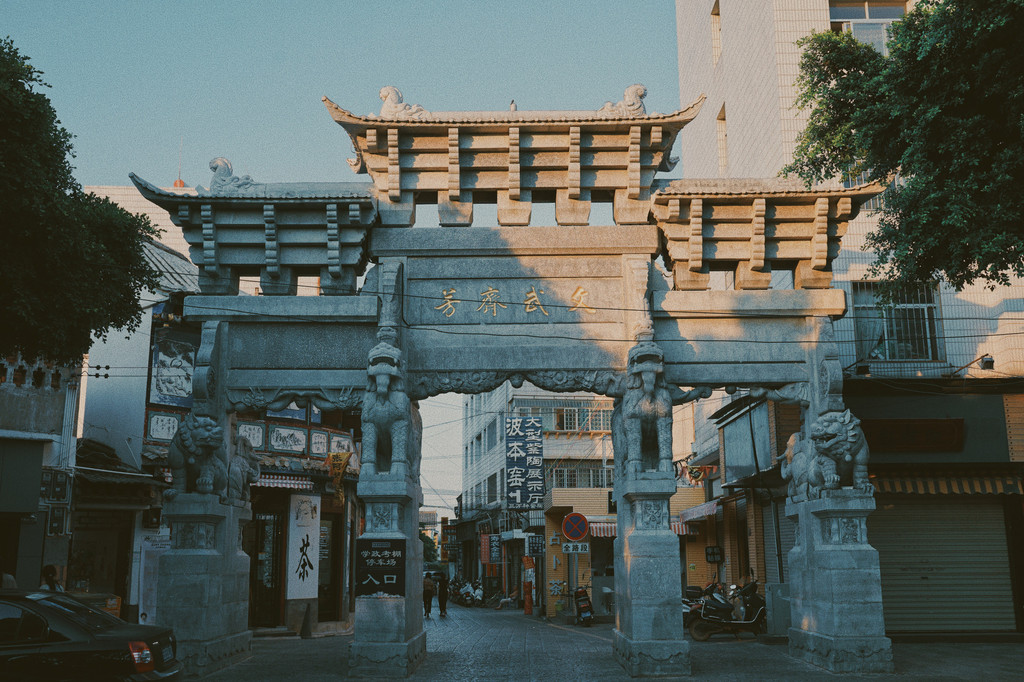 自城门进入,脚下的道路陡然变成了长短相接的石板路。穿过接连不断、气势十足的石制牌坊,走过高低簇拥着的店铺招牌,一个路口的连接着许多个路口,一条小巷的尽头是另一条小巷。这个古城,似乎很难走到尽头。因此,迷路也就成了常事。