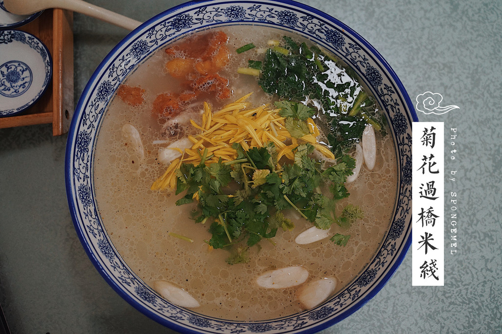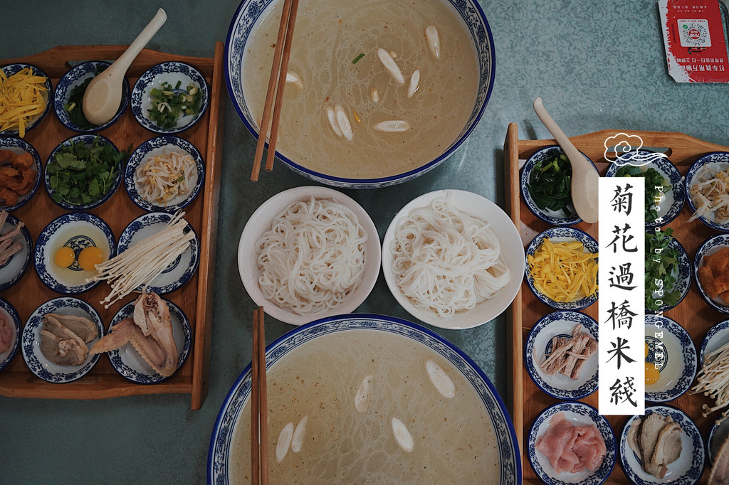 滚沸的鸡汤上桌,趁热将食材按照“先生后熟”的顺序放入鸡汤:先是鹌鹑蛋的蛋黄,再把肉片、鱼片等放入蛋清中拌匀,下入汤中,最后加入韭菜、豆腐皮等配菜和米线。最上面撒上菊花、香菜、葱花,一碗“菊花过桥米线”就这样在自己的手中诞生了。