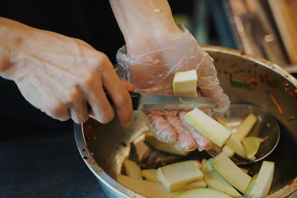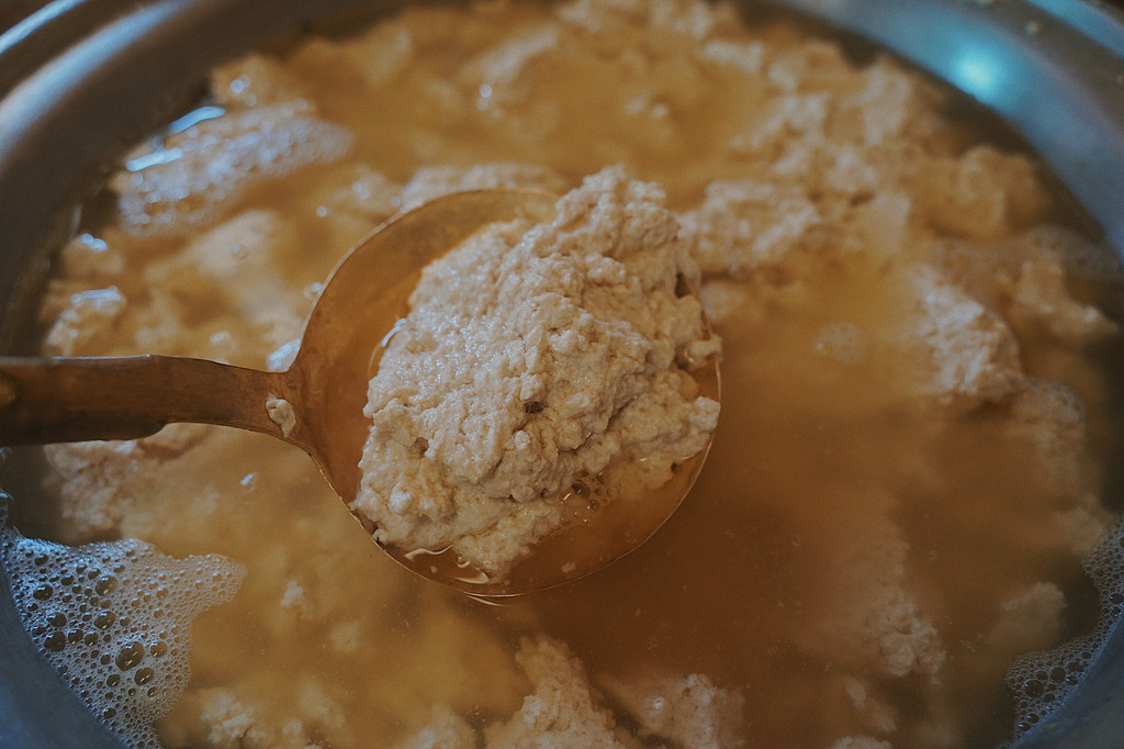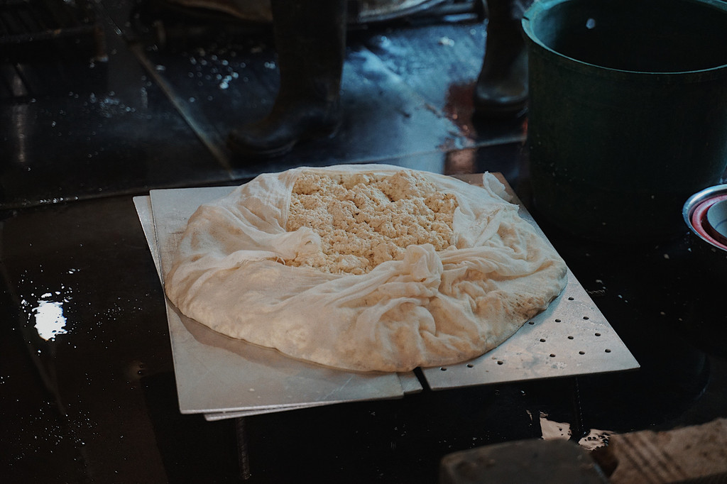 守着大板井得天独厚的地理位置,板井豆腐坊成为了这一带规模最大的豆腐店之一。一进门,就闻到浓郁的豆腐味道,制作豆腐的房间就在一楼,一排大个的蒸笼滋滋地冒着热气。房间另一边,工人一只手拿着一块纱布,另一只手把豆腐放入纱布中包起来,拧紧、再揉搓几下,豆腐便定型成了大小相同的小方块。
