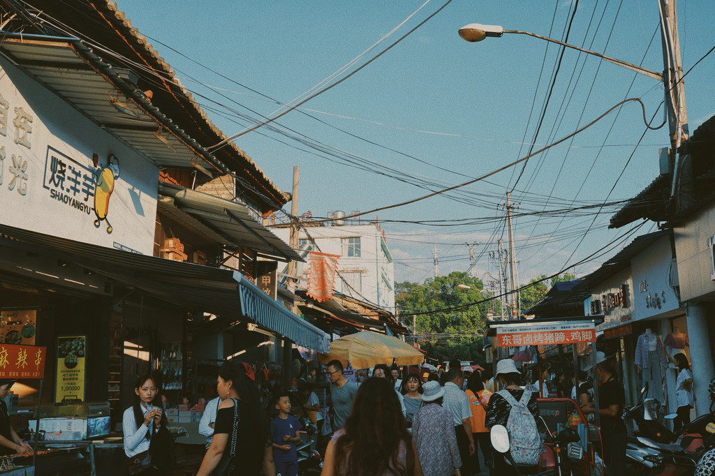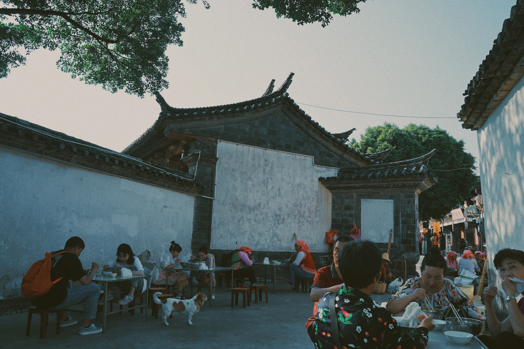 然而,迷路却并不乏味。主路的两旁,是闭着眼睛也能想到的“商业繁荣”:售卖茶叶、紫砂、汉服、民族风饰物的店铺,如今已然成为了所有古城的标配。转身入巷,才发现古城的生活别有洞天:沿街的叫卖声越来越远,如隔云端;烤豆腐的阿姨身边围满人群,双眼焦渴地望着阿姨手中的长筷;猫和狗在巷子口相遇,彼此对望然后并肩往巷子深处走去。