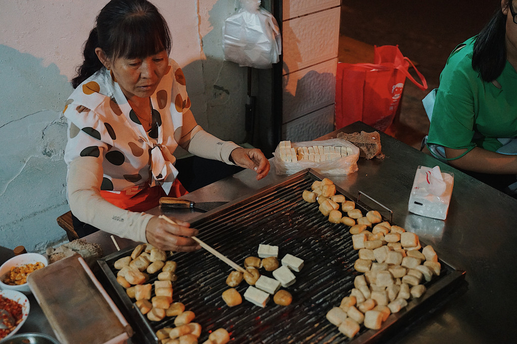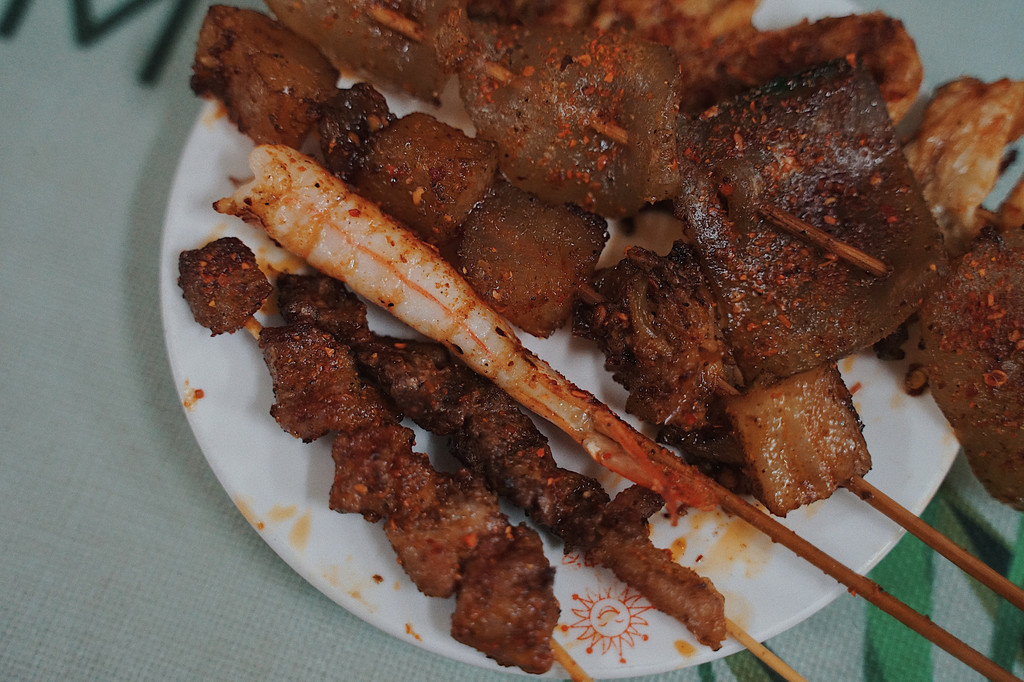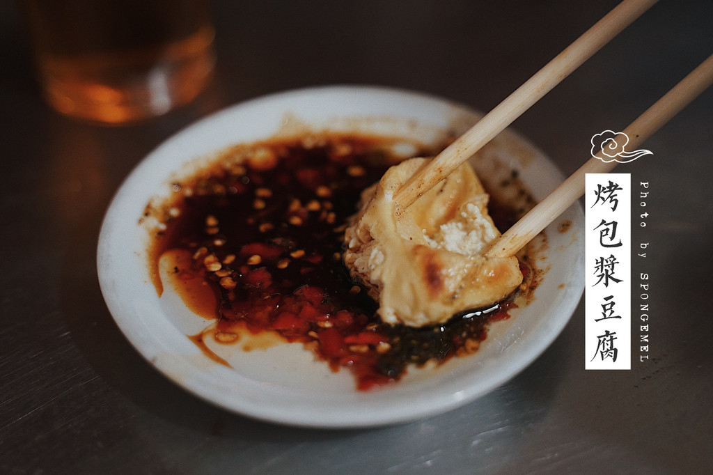 这里的烧豆腐,多是一寸见方的正方体小块,莹白的豆腐放在烤架上,在热气的作用下,表里逐渐变黄变硬,内里渐渐膨胀起来变成一个小圆球。咬开一个小口,热气扑鼻而出,有些酥脆的外壳下,内里还是软糯的,带着浓浓的豆香。蘸上一点蘸水,豆腐疏松的小孔吸满了料汁,味道十足,吃起来回味无穷。