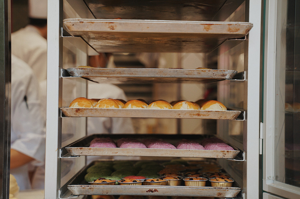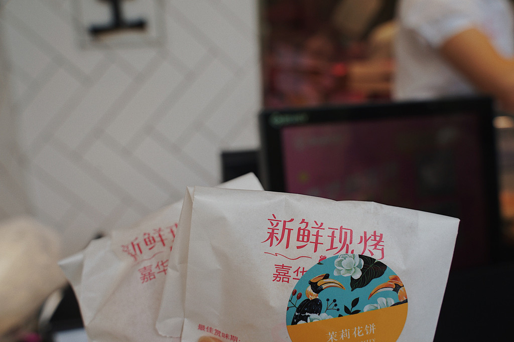 柜台的小姐姐动作娴熟,一人负责包装另一人负责结算。身后的操作间里,几位师傅忙碌地将鲜花内馅包裹进酥皮、放入烤炉内。偌大的烤炉内整齐排列着一个个等待被高温唤醒的柔软胚胎,静静地等候时间和温度赋予它们面颊金黄的点缀,和由内而外散发出来的温柔的芬芳。