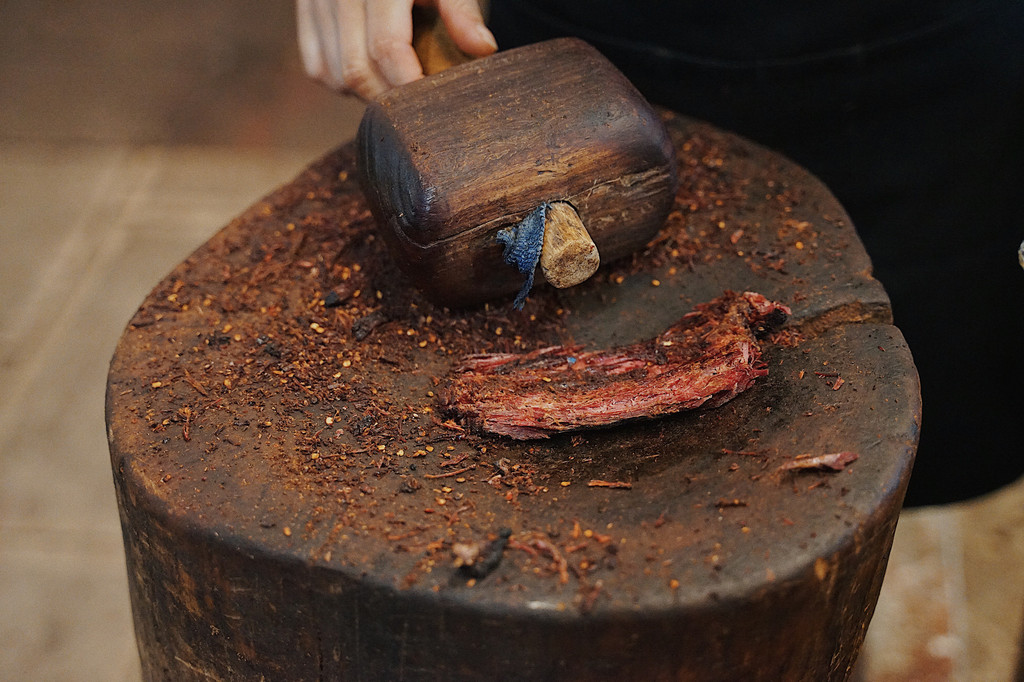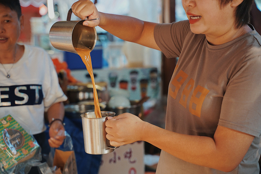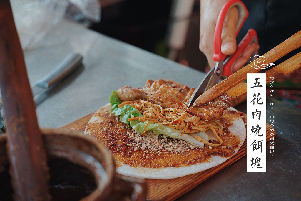 一边的入口处,有一整片小吃摊:看起来就很酥香满足的五花肉烧饵块、冰爽香浓的袋装泰式奶茶、离开 云南 别处很少见到的傣味拌芒果,还有需要先放在树墩上用木锤砸至松软,再撕开拌好的牛干巴......很多正宗的 云南 美食,在这里都能找到。