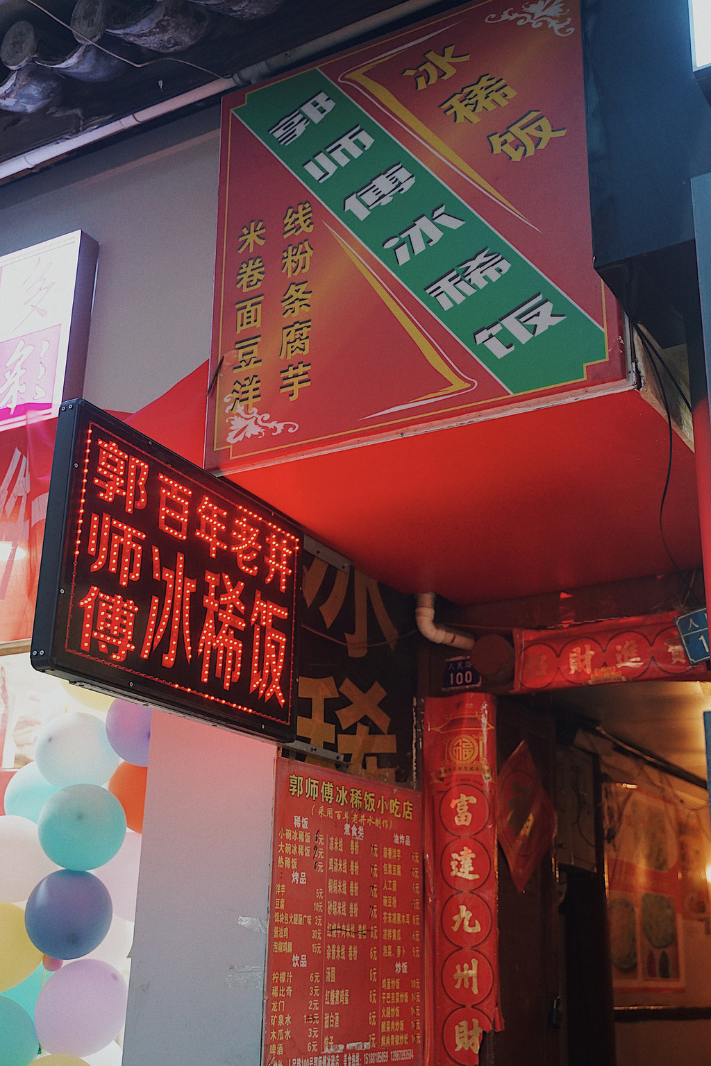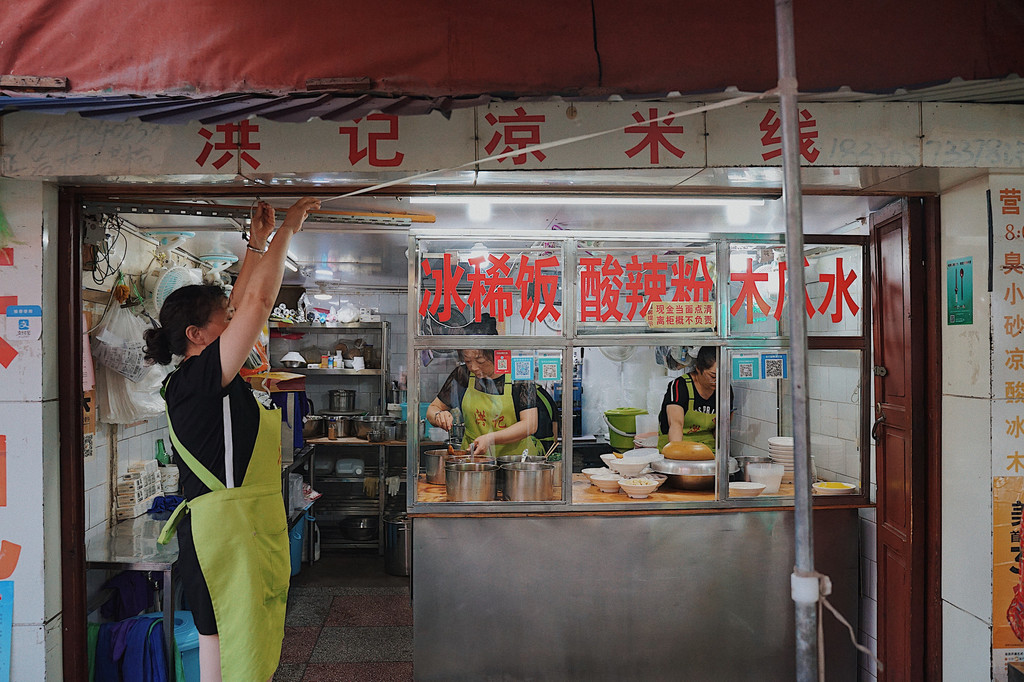 位于宝善街的建 新园 老店,现在每天依然还是大排长龙。店里位置不够,很多人干脆坐在门口的小板凳上端着米线吃。