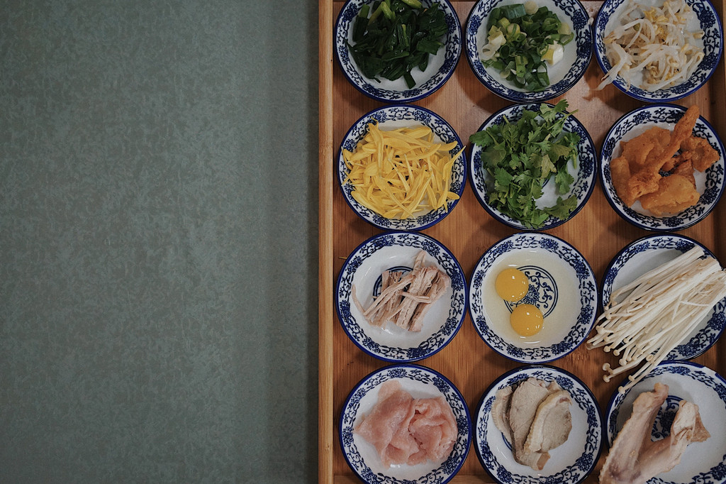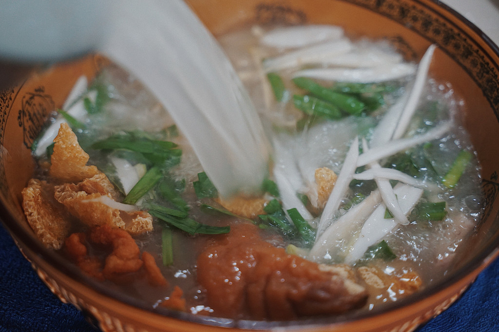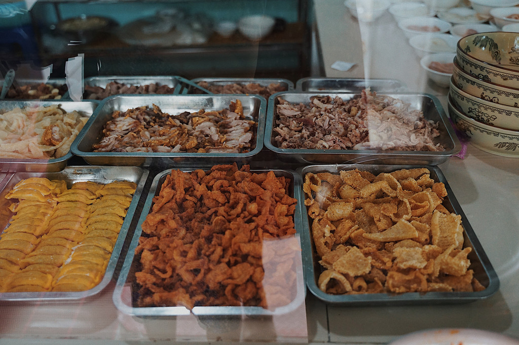 虽说已经过了通常的早饭时间,但刚到时还是被店里坐的满满当当的客人吓了一跳。和气的老板娘先带着我们在店门口选套餐,不同配菜数量便对应不同的价格。玻璃橱窗内,金灿灿的猪脚、炸猪皮、酥肉、里脊、蛋饺等都可以自选,如果不是跟着前面的当地人,真的难以抉择。店家将选好的肉类及配菜放好后倒入一碗“灵魂高汤”,“哗”的一声,碗中热气升腾。而后的事,就要食客“自己动手,丰衣足食”了。