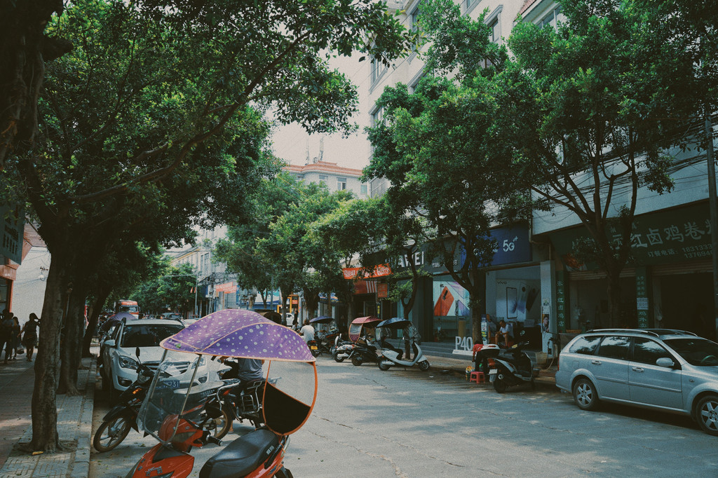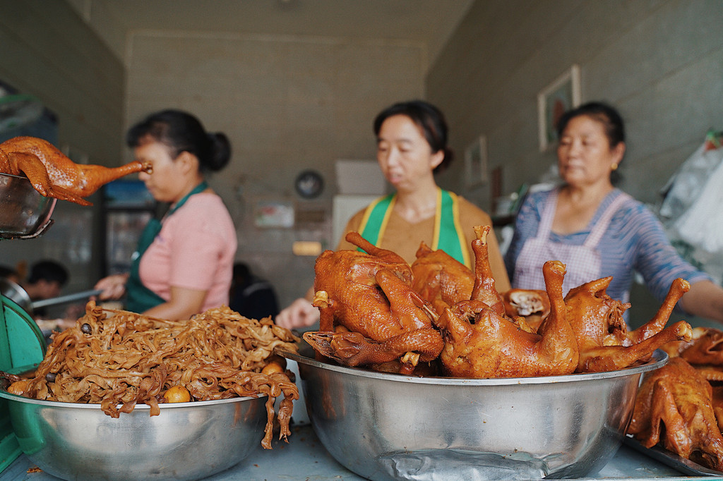 穿过一片乌烟瘴气、尘土飞扬的砂石路,就到达了竹园镇中心。不算宽敞的马路两旁无序地放满了车辆和电瓶车,停车成了难题,见缝插针的同时还要时不时与对面而来的大型车辆小心交汇。街道两边偶尔有包着头巾的妇女兜售小吃和水果,树木茂密的树冠遮盖住了店铺的招牌,隐隐约约看到出现最多的两个字——卤鸡。