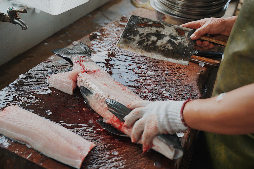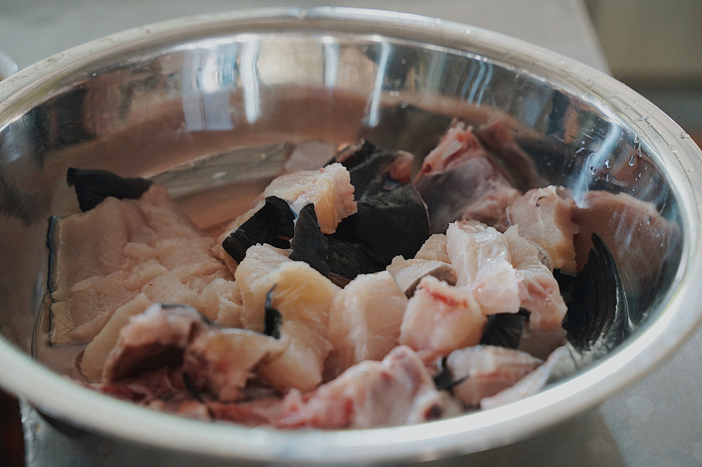 自家都有小型的鱼塘,选好了哪一条,捞起来,快速宰杀放血剁成大块。端上桌时,鱼肉仍然是干净的莹白色。水开后下锅,几分钟后,鱼肉嫩到只轻轻一拨就与骨头完全分离开来。