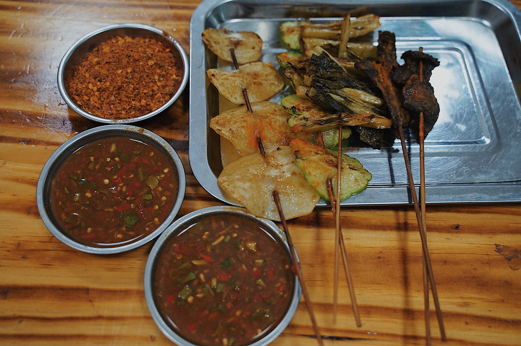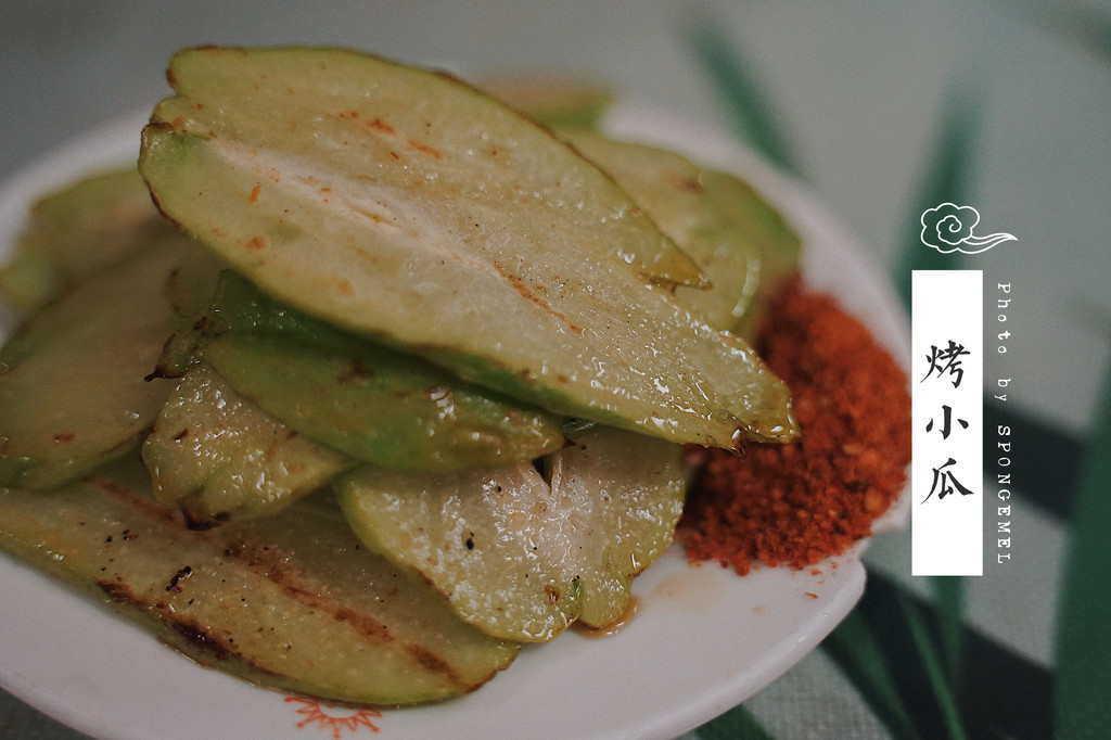 烧烤的风格上, 建水 的烧烤似乎又自成一派:烤草芽是“地区限定”,只在 建水 最常见,猪身上的各个部位也都被充分利用了起来——五花肉、猪皮、牙梗......刷上特制酱料,撒上辣椒粉又香又辣。烤小瓜格外惊艳:小瓜被切成厚片,在火上烤软、刷上酱汁,吃时蘸辣椒粉。口感似西葫芦又有不同,似是平淡,但又爽脆清香让人无法自拔。