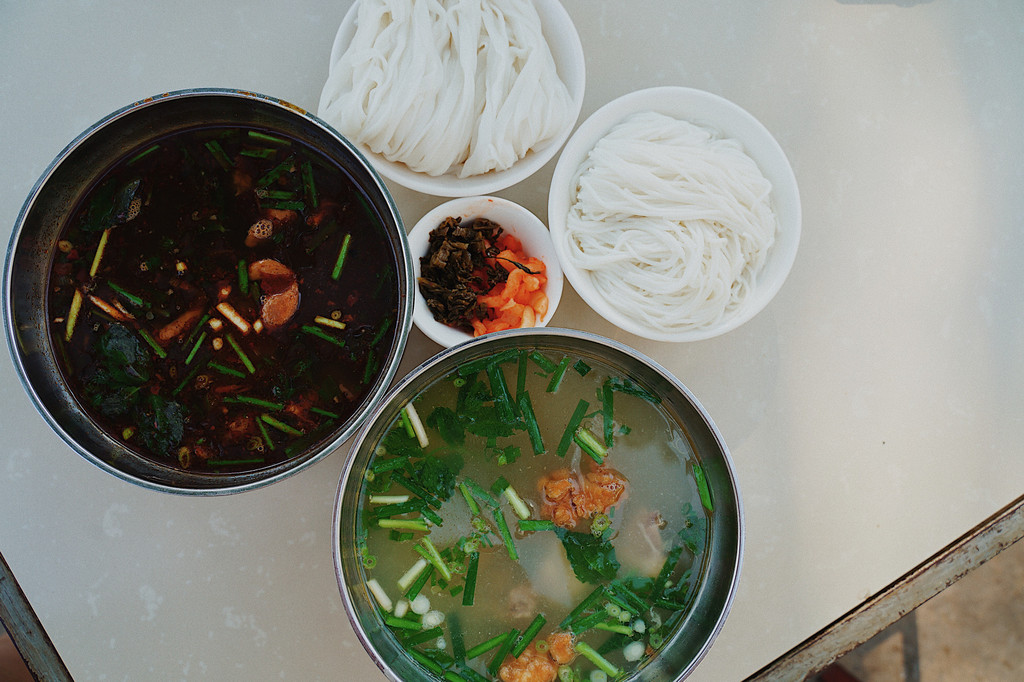米线和卷粉一碗一碗地放在一侧,自助选择不需要另外收费。米线是传统白米线,卷粉则可能加了红米,泛着淡淡的好看的粉红色。若是喜欢劲道一点的口感,可以直接把粉倒入自己的汤中开吃,喜欢软一点的,可以在旁边的沸水中汆烫一下再吃。