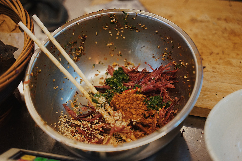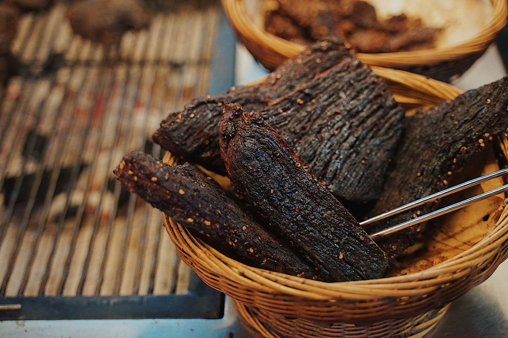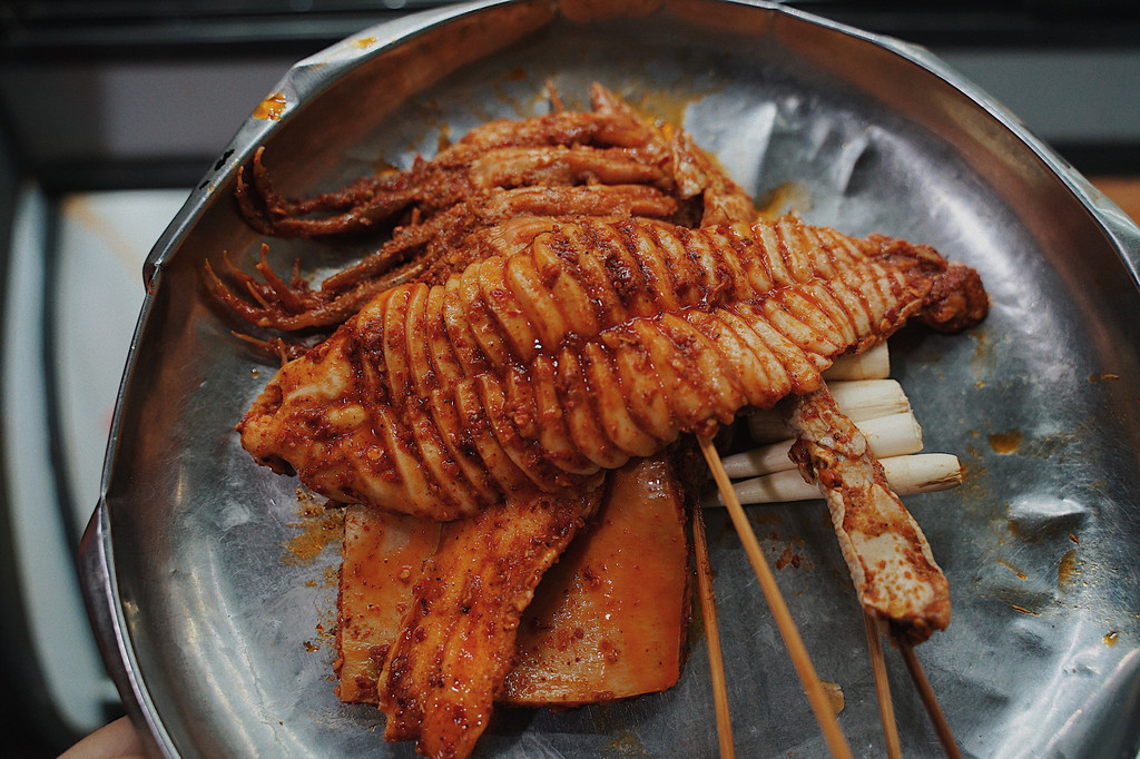 卤过的食材带有微辣的本味,炙烤之后,趁着热气刷上一层辣酱。似乎是又觉得不过瘾,于是再密密地撒上了一层辣椒粉。