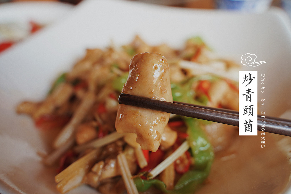 青头菌,大概是 云南 林间最常见的一种菌子。菌盖是淡绿色,即使炒熟了还依然带着隐约可见的绿色。这菌子口感肥嫩厚实,纤维之间透出山林的清爽气息。加大量的油,与辣椒、香芹同炒,几种食材的味道相得益彰。