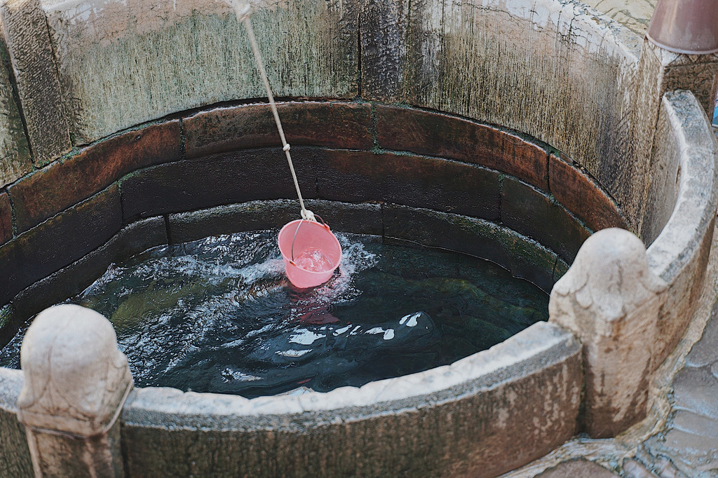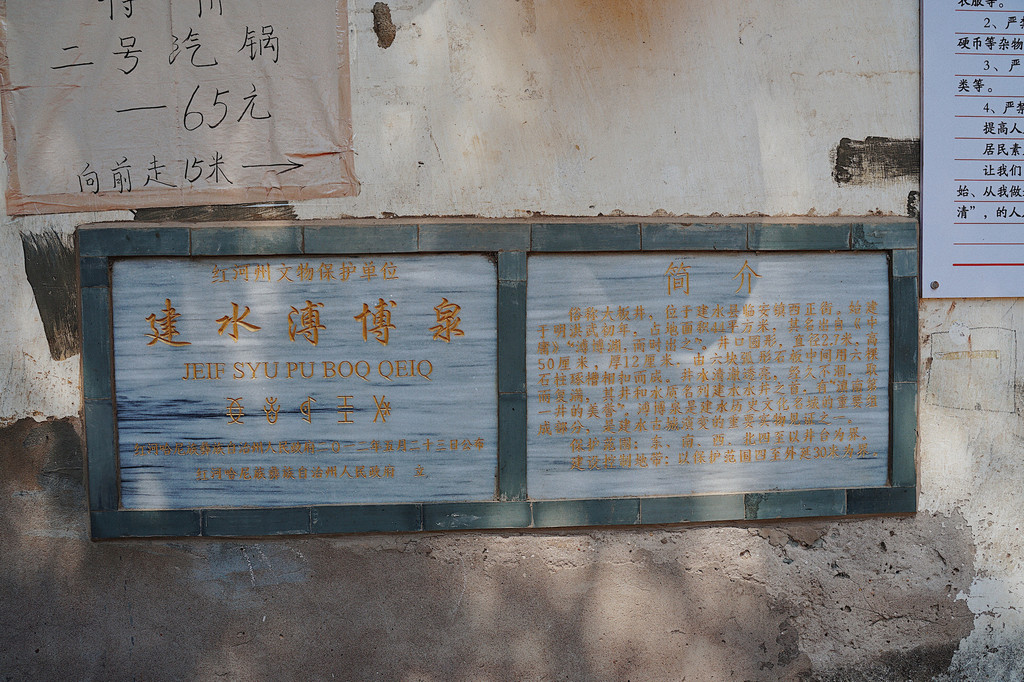 云南 人认可 建水 的豆腐,主要原因,便是这里做豆腐的水好。古井几乎已经成为 建水 古城的一道景观,常有多眼井口聚集在一起的,井壁被长年累月的绳 索拉 出了深深的痕迹。最为有名的,便是西门大板井,又叫“溥博泉”,井水清冽甘甜,特别适合饮用、泡茶、做豆腐。直至今日,这口井依然是当地居民生活饮用水的主要来源,总能看到几位大伯人手两个大水桶,从小巷子中弯弯绕绕而来,又满载而归。