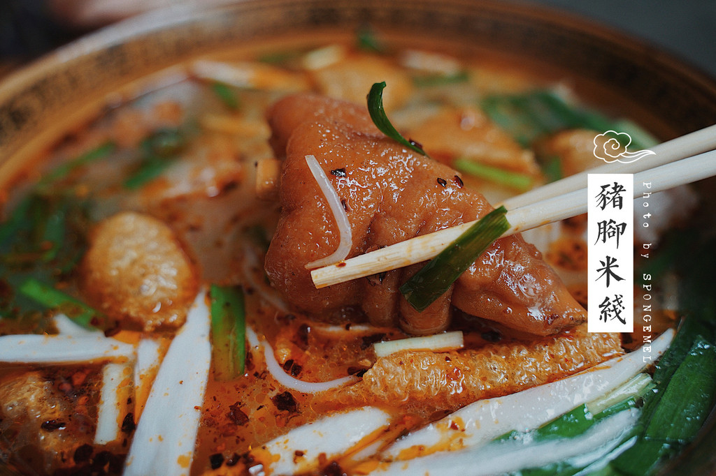 猪脚是炸过之后再红烧的,切成了大小合适的块,不软不硬,口感酥香,也没有了正常炖猪脚那种肥腻粘牙,哪怕多吃几个也不担心腻得发慌。不像过桥米线,这里的猪骨汤底已经事先撇去了油,只剩精华的骨汤,清爽醇厚。浸入汤汁之后,肉类经过大火油炸后表面那些小孔,饥渴地吮吸着水分,一口咬下,汤汁四溢,肉香扑鼻。一定要再加几滴自制的油辣子,辣油混合着汤汁的香气,带来一大早的神清气爽。