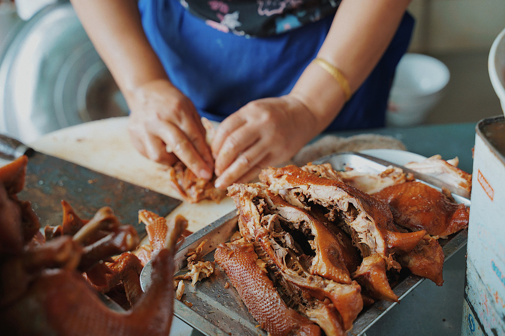 接下来要做的,便是开门迎客。街头巷尾大大小小的卤鸡店,一边售卖卤鸡/卤鸡杂,一边另起炉灶煮水,烫过的米粉/卷粉加入卤鸡的汤汁,再在上面铺上几块卤好的鸡肉,就是当地人最爱的街头美食——卤鸡米线/卷粉。络绎不绝的客人到来,店家阿姨娴熟地从面前扯过来一只鸡,手起刀落之间鸡肉被肢解开来,接着烫粉、浇汤、加入鸡块......所有动作一气呵成,一碗粉带着锅内的热气被食客颤颤巍巍地端到店内的矮脚桌上。