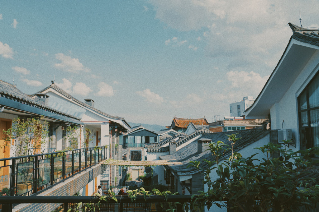 登上客栈三楼的走廊,一个个屋顶相连,一直延伸到远方。几栋古建筑的瓦片在颇为崭新的屋群中显得格外显眼。古城的大,似乎望也望不到边。