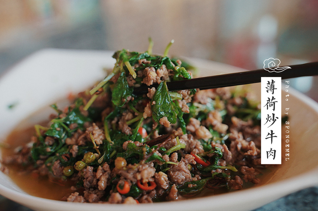 哈尼族的小炒牛肉,用的是切成小块的牛肉末,加入薄荷叶、花椒和小米辣同炒,辣椒的口感中又有薄荷叶的清香,哈尼族人果然擅长用各种香草,创造与众不同的好味道。