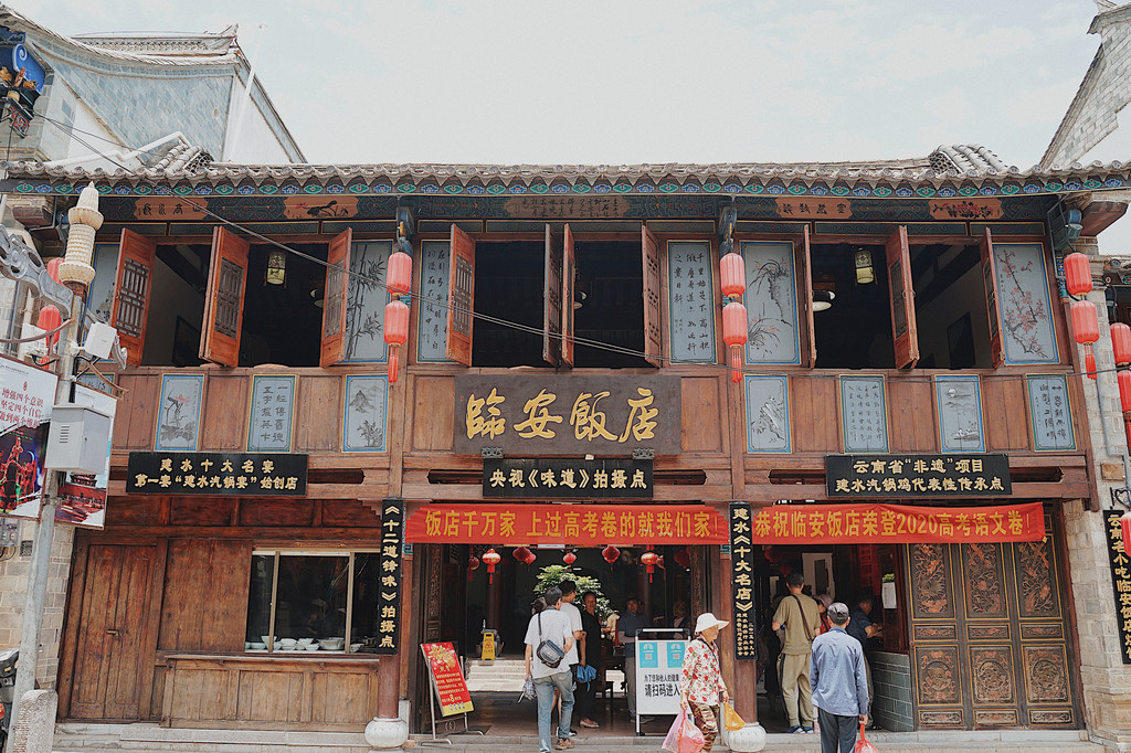 古城内的 临安 饭店,乍一看很像是名声在外但却被游客占领的老牌饭店,最不缺的就是荣誉。进门之后,服务人员的热情和气让人有种意外的惊喜。刚到中午饭点,大厅已经全部坐满,其中也不乏很多本地家庭在此周末团聚。这里的汽锅鸡,据说用的是最费工夫的传统做法,每天上午开始上锅,中午开始售卖,售完为止。大门口买券,指定窗口排队拿菜,用一个托盘颤颤巍巍拖着一个小汽锅,走回餐位的途中,香气已经争先恐后地扑入鼻腔了。