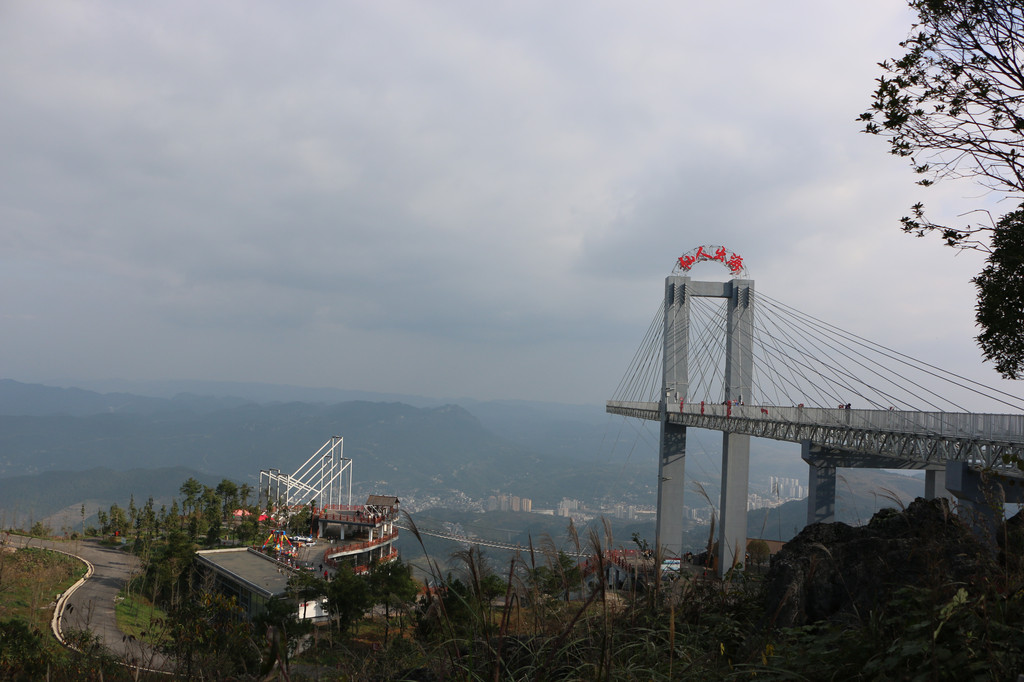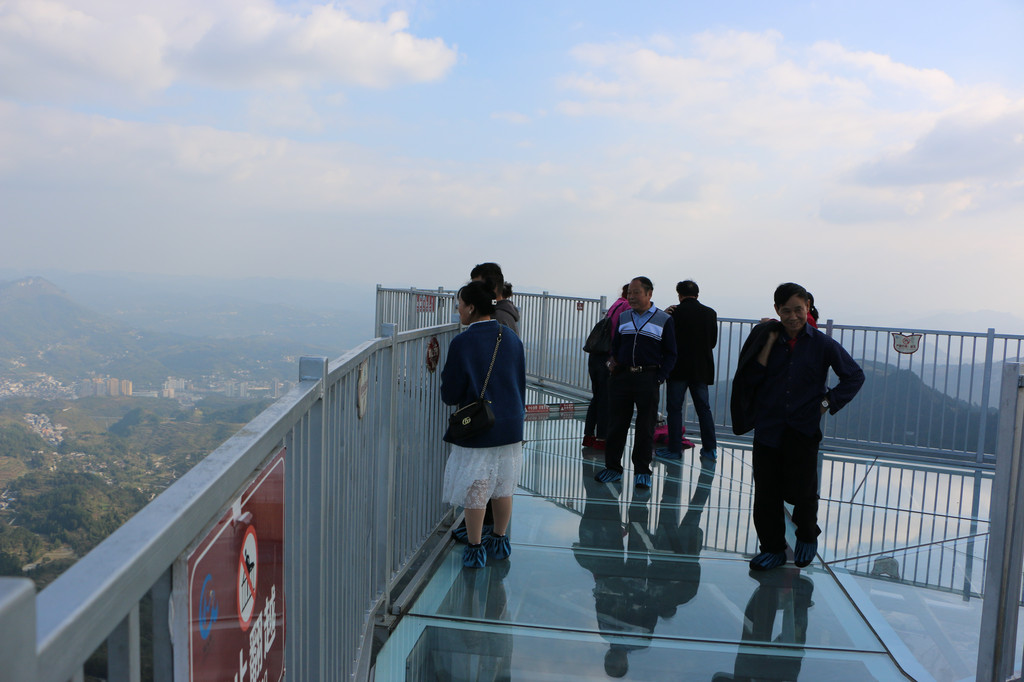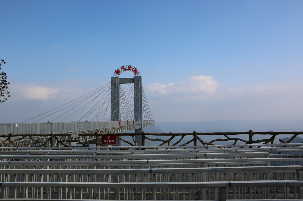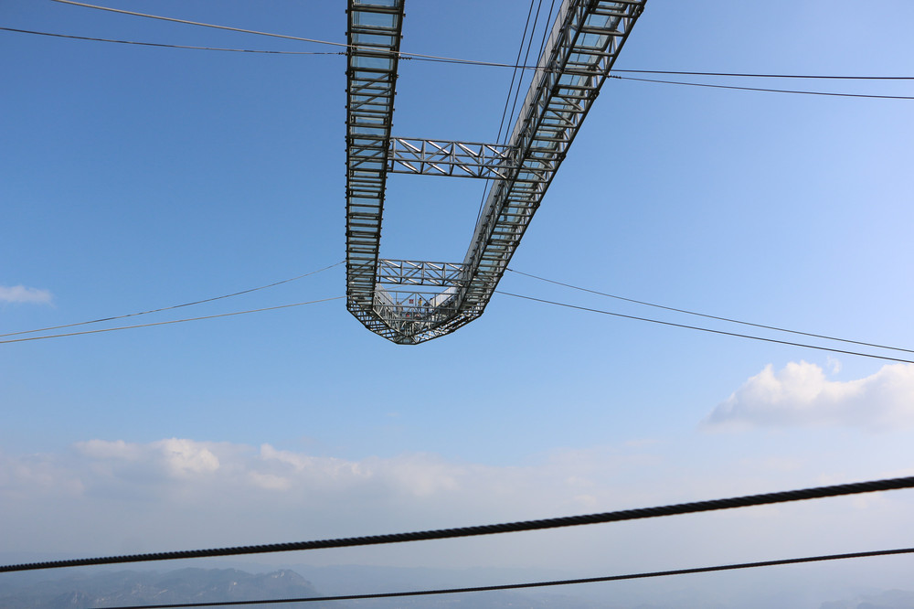我三步并两步,发挥当空军一不怕苦、二不怕高的勇气,一口气登上“悬挑空”!站在顶端,发现“悬挑空”,恰如其分。“悬”,置身在550米高悬崖峭壁;“挑”,钢架横向挑出230米外;