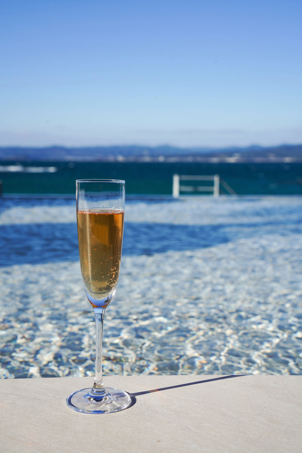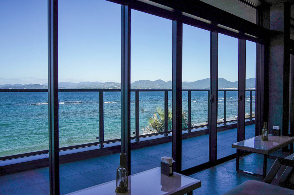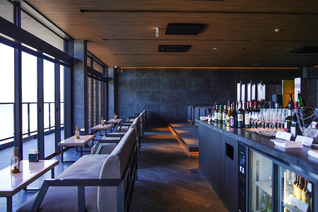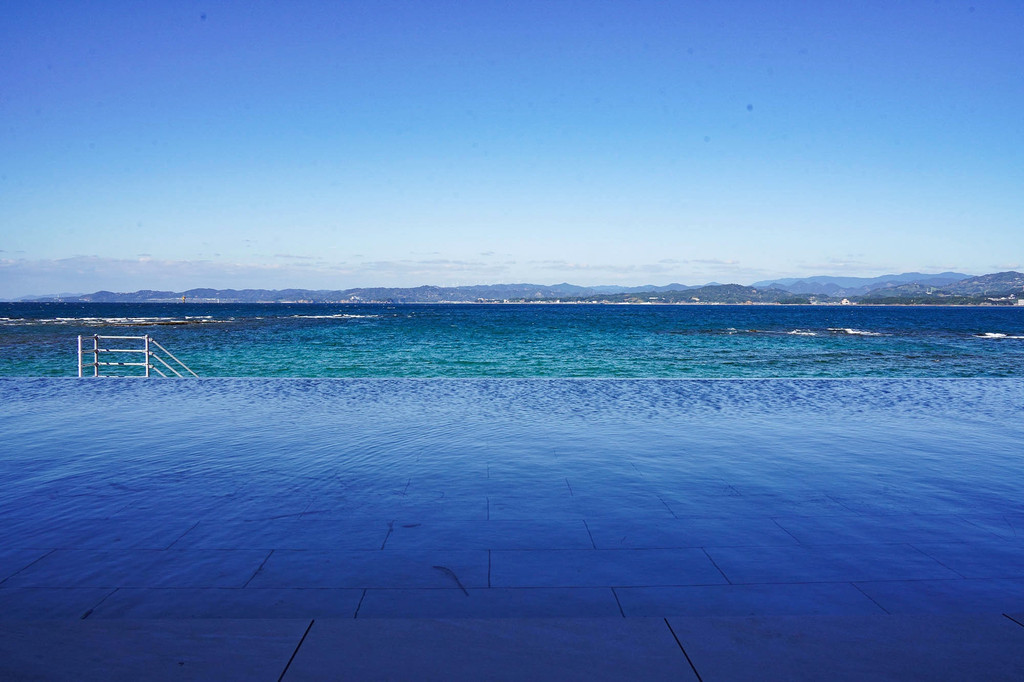 lobby面海的方向是一面巨大的落地窗,室外是一个亲水平台,与前面的大海连成一片,水天一色既视感。