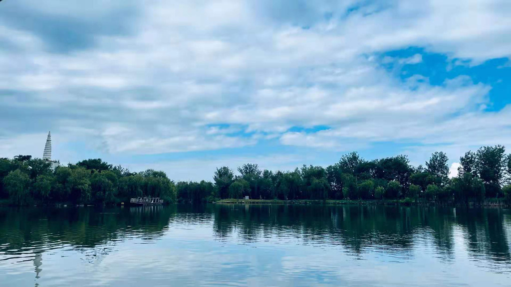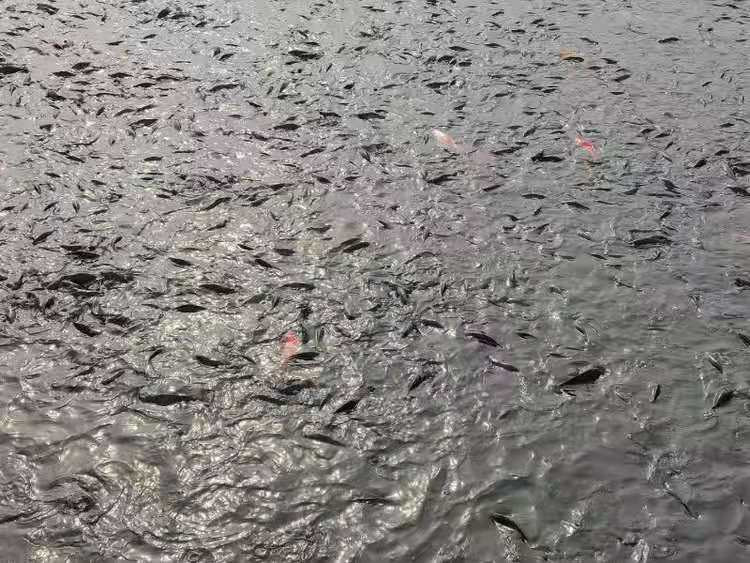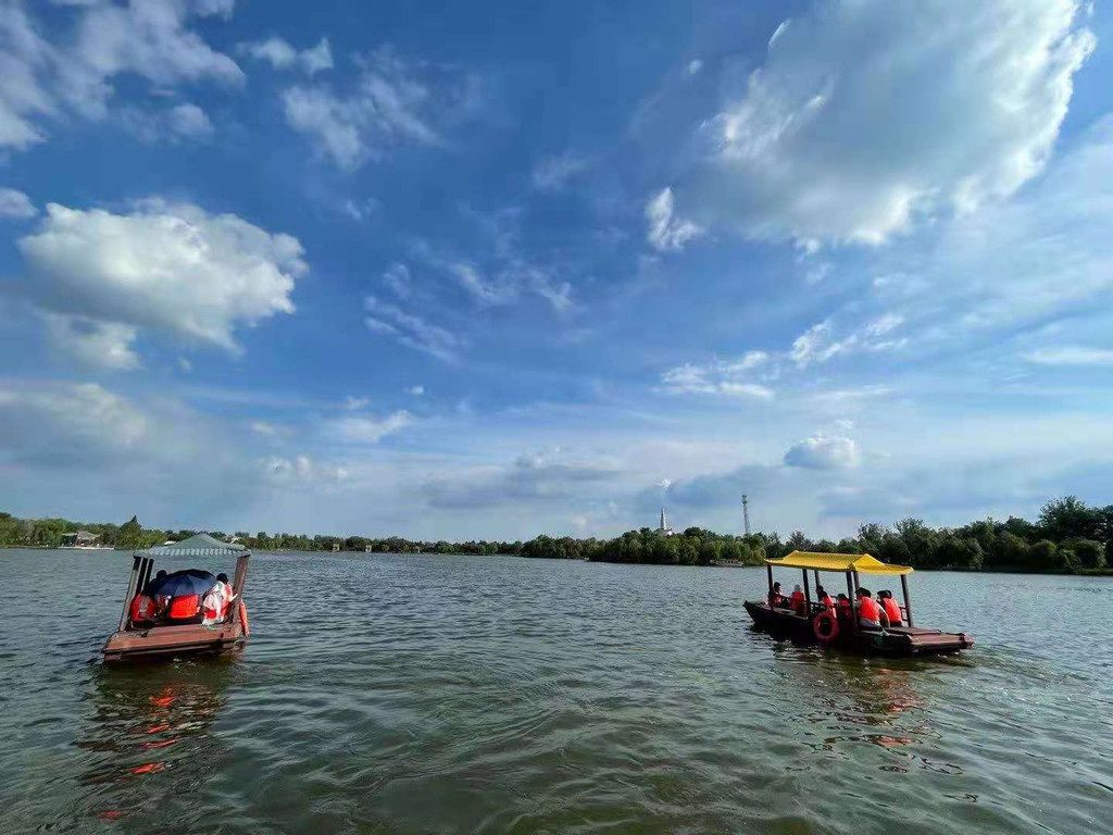 登上被绿色环抱的罗绮山,可以俯览园区的全景。据了解,这座山是人工挖掘湖池堆积而成,山高19.98米,是人们口中戏称的“寿北第一山”。罗绮山上下来往北走,正赶上给鱼喂食,各种各色的鱼聚集到湖边,群鱼争食的场景实在是太壮观了。