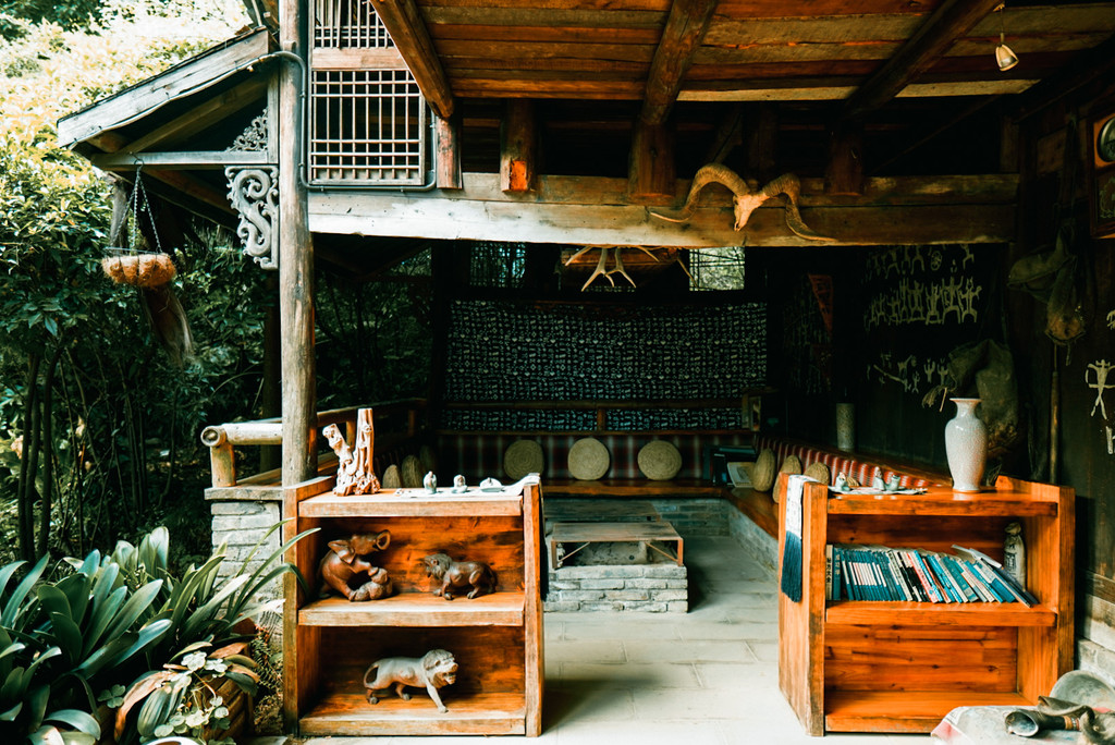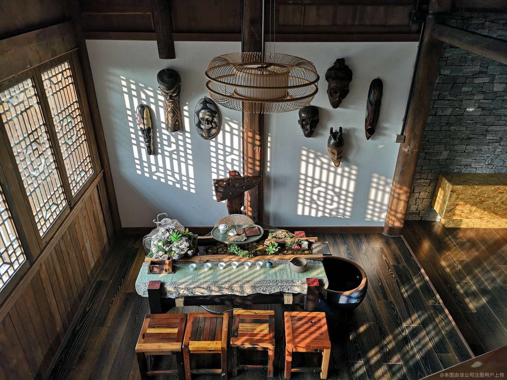 登上阁楼,弯曲的护栏和长木凳散发着古典的韵味,雕着古文字的石板路,精心修剪的灌木,庭内充满历史厚重感的坛瓮,传递着主人所投入的情感和匠心。 十几年前的一座荒山,十几年后的猎户部落。每一个部落都用藤蔓植物点缀的郁郁葱葱,无论冬夏,绿意盎然,使用荖字作为名称的一个在台湾荖浓溪,另外一个就在大陆的荖猎户。草字头的荖,长青不老,生生不息,是部落草。