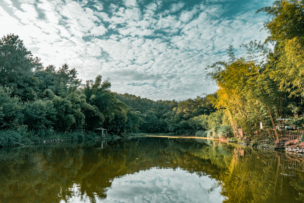 作为距离 成都 最近的森林部落、林盘景区,整个山庄郁郁葱葱,绿意盎然,翠绿的树叶挂满树枝,草地上经常可以看到觅食的野兔,它们自由自在的吃着草儿,湖中是嬉戏的鱼儿,湖面上有时会有飞鸟掠过,整个山庄呈现一幅祥和的景色。