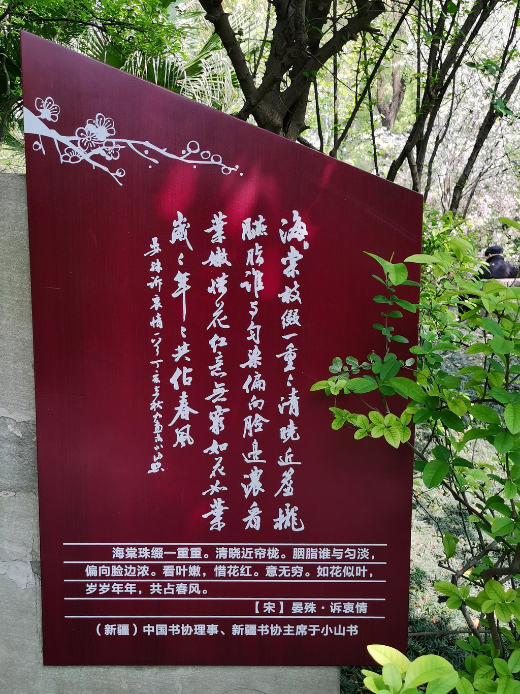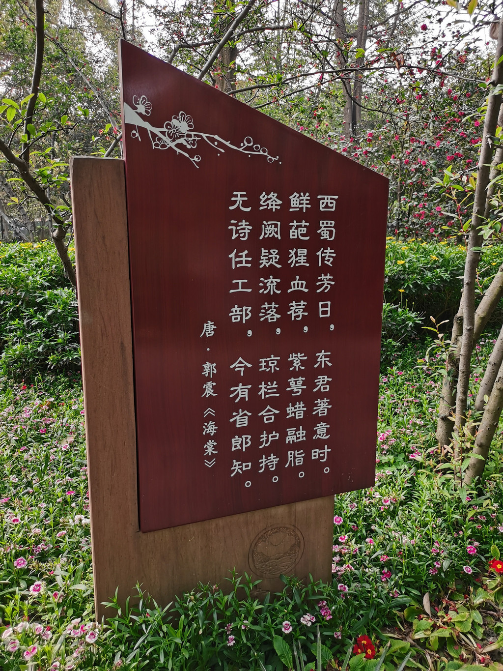 唐代名将、宰相郭震(字元振)曾为海棠作诗一首:“又随桃李一时荣,不逐东风处处生。疑日四方嫌不种,教於蜀地独垂名”。有人考证,为什么海棠花是蜀地独垂名呢?因为郭震说,海棠在四川是山野之花,花好看,但花期短,果实实用价值不高,难以推广。唐朝之后大面积种植,主要看中的是海棠树木的实用性和很强的观赏性。但是由于不易管理等原因,怀疑其它地方嫌弃不种,只有四川这个地方茂盛,所以四川海棠就有名了。现在四川双流的海棠公园海棠花盛开,人们赏春首选赏园中的海棠花,满园春色就数海棠花的名气最大了。