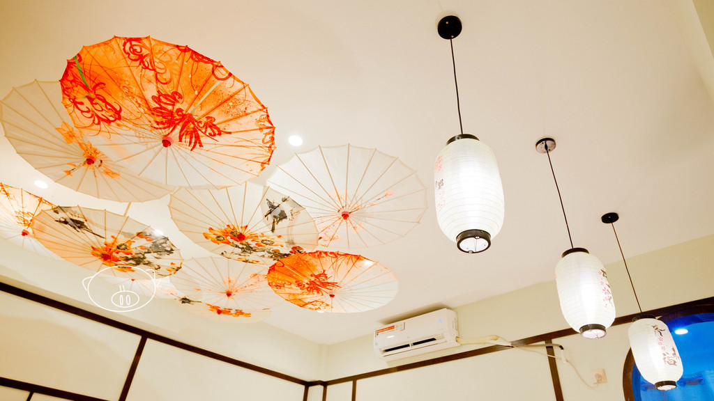 躺床上看片舒服哦,屋顶还有装饰的小纸伞和小灯笼,很有feel