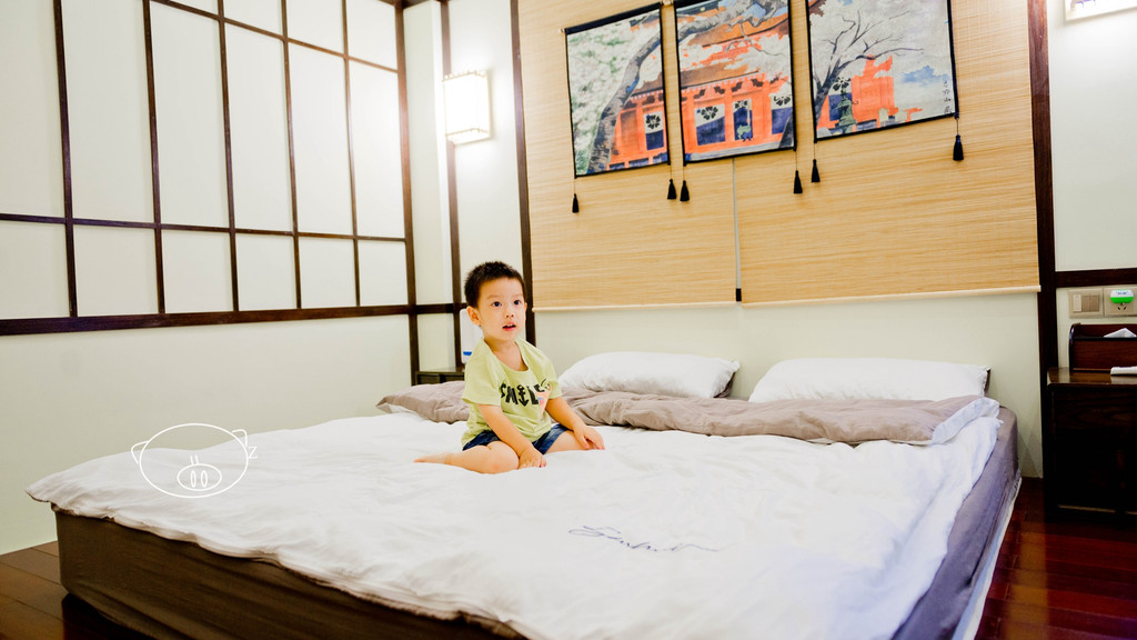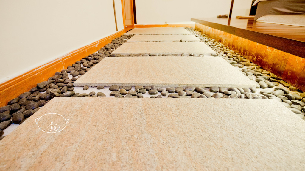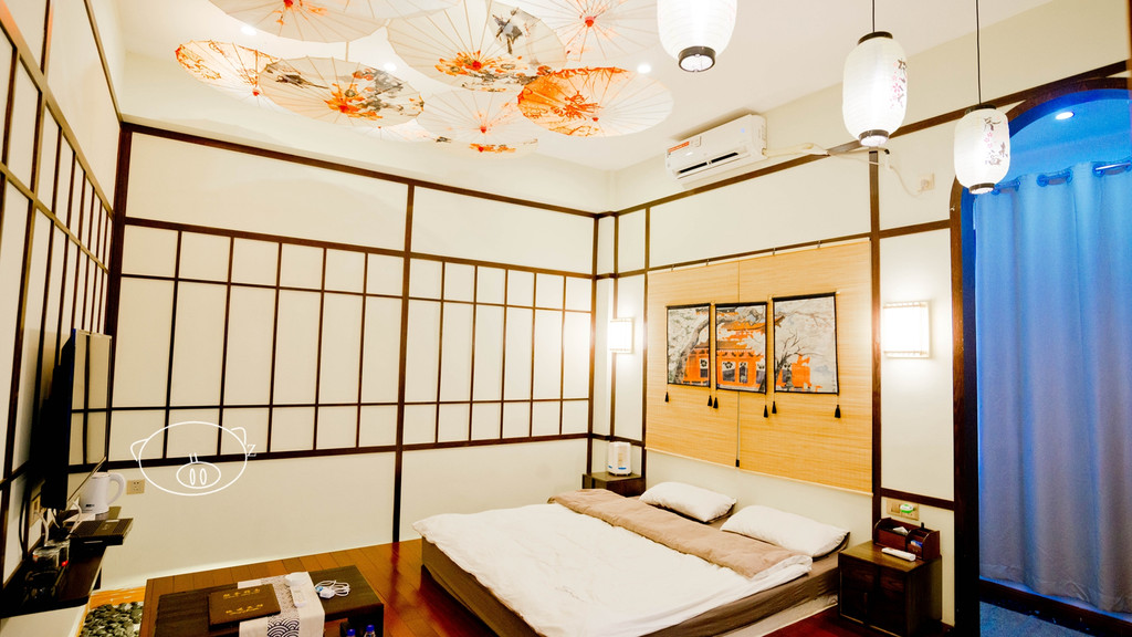 日式风格房,木制榻榻米设计,上面一张大床垫,一张茶几,茶几上有一些日用品,还有赠送的矿泉水,大大挂墙液晶电视,躺床上看片舒服哦,屋顶还有装饰的小纸伞和小灯笼,很有feel,榻榻米下,做成一条小路,铺满小石头。有阳台,窗外能看到容桂的镇貌,免费WI-FI,分体空调,卫生间干湿分离,配有淋浴间。