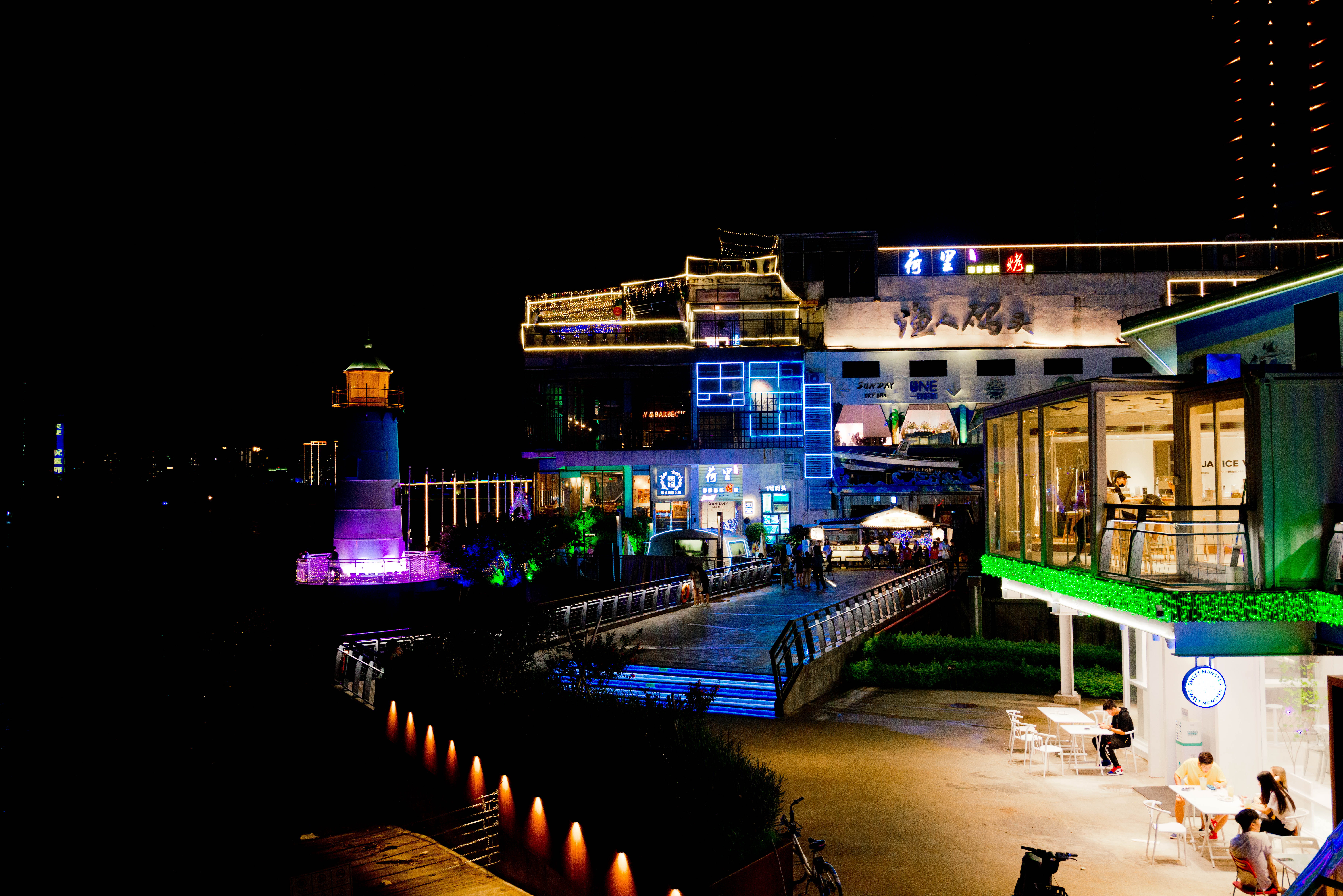 周边有数个停车场,停好车后,徒步走进去。码头里面其实不大,感觉有点像广州的太古仓,有格调的餐厅林立,每个建筑或者装饰都有着自己的风格。食品厂外墙上喷涂了各种各样的猫咪,楼顶还有一个超大的大白,非常有标志性。霍尔锚和机械船身很酷,海湾的灯塔是另一个地标性建筑,也是一个必打卡圣地,来到的朋友,都会拍上一张。