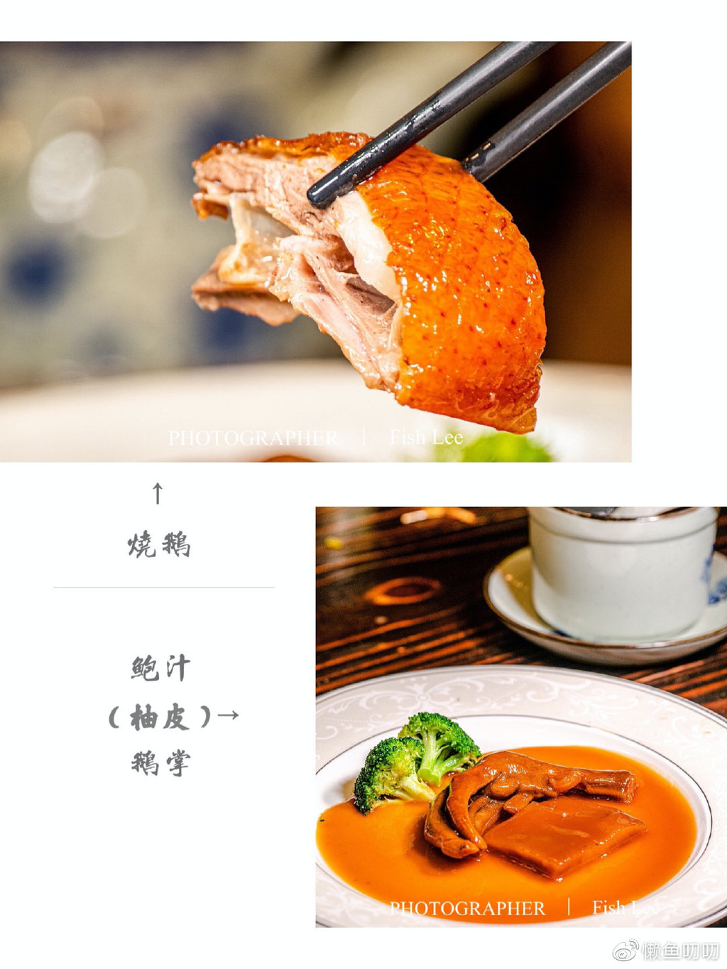 还有鲍汁柚皮鹅掌和烧鹅,两种做法的鹅都直击我的灵魂。鲍汁提鲜,清爽的柚皮吸足了鲍汁之后,入口绵软香沁,还有满是胶原蛋白的鹅掌软烂适中,好去骨而未食之时不毁其形。至于烧鹅,肥而不腻,油香肉润,一口下去皮是咔吱脆爽。