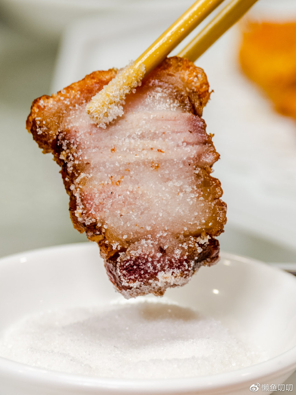 肥瘦相间且肥而不腻的烧肉,吃到口中皮脆肉香,再蘸上犹如点睛之笔的白糖,咸与甜的中和在舌尖起舞,久久不能平复。
