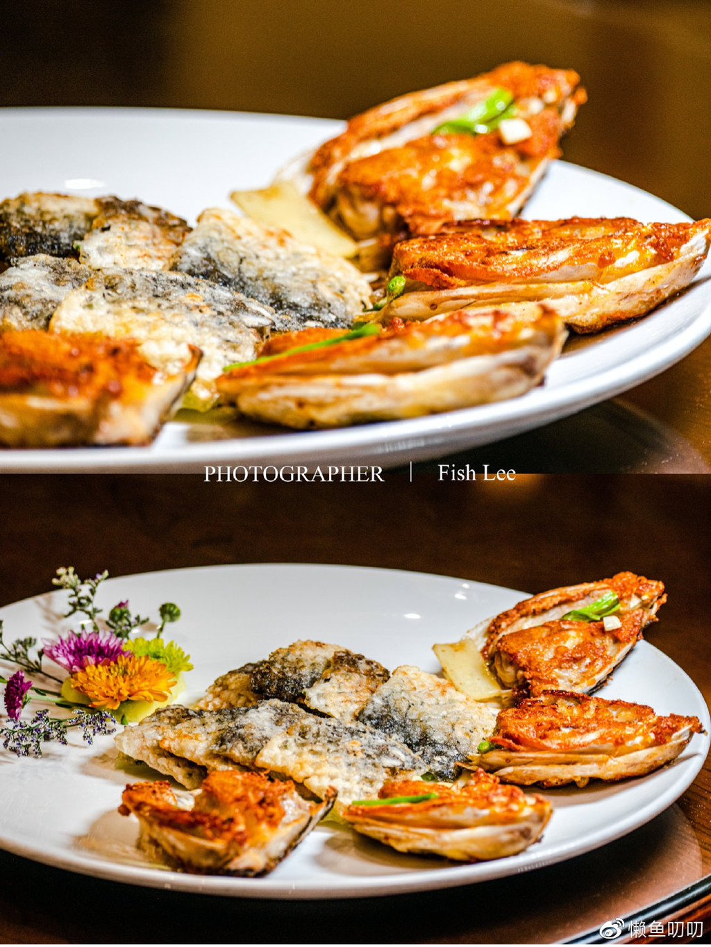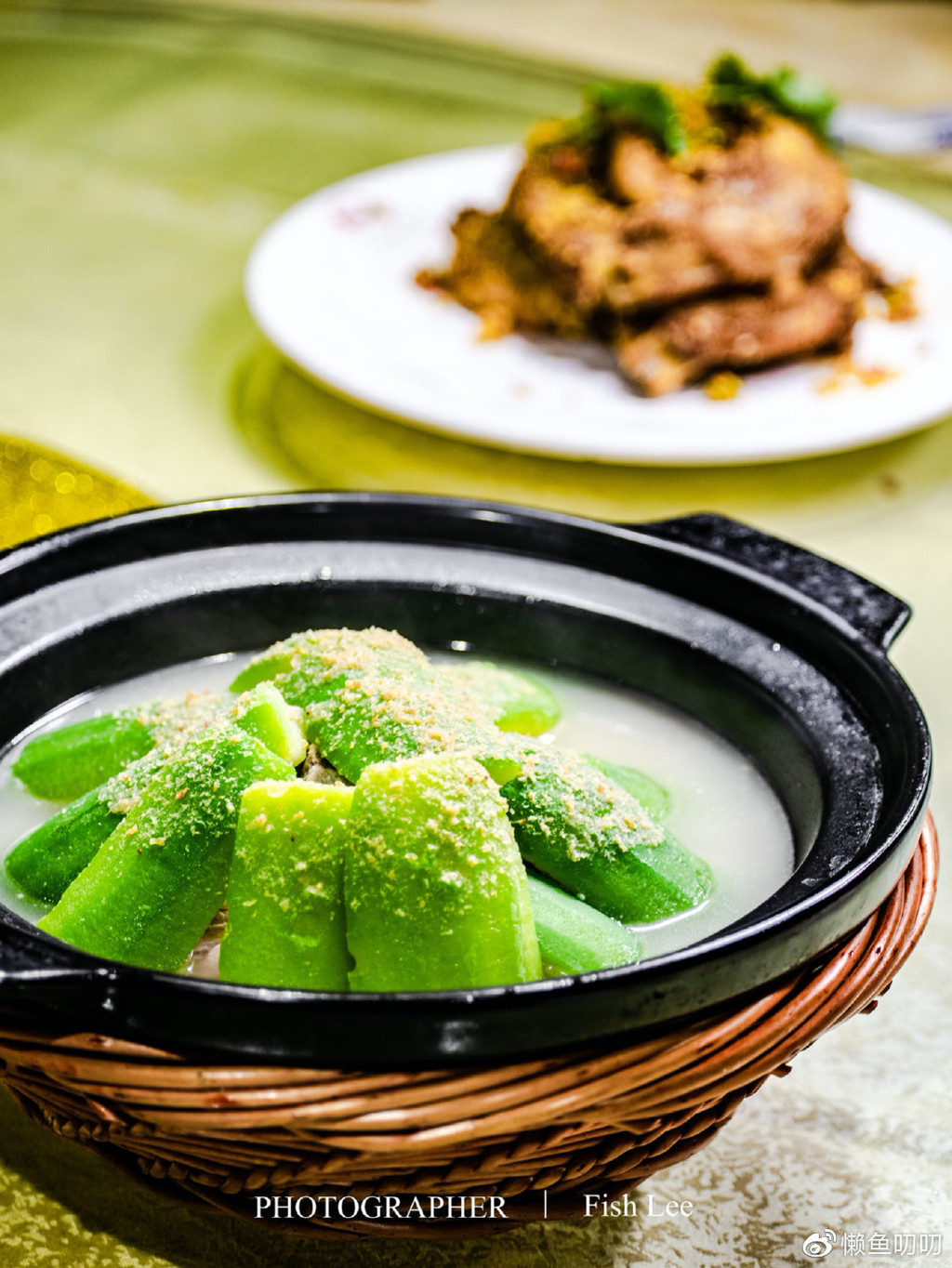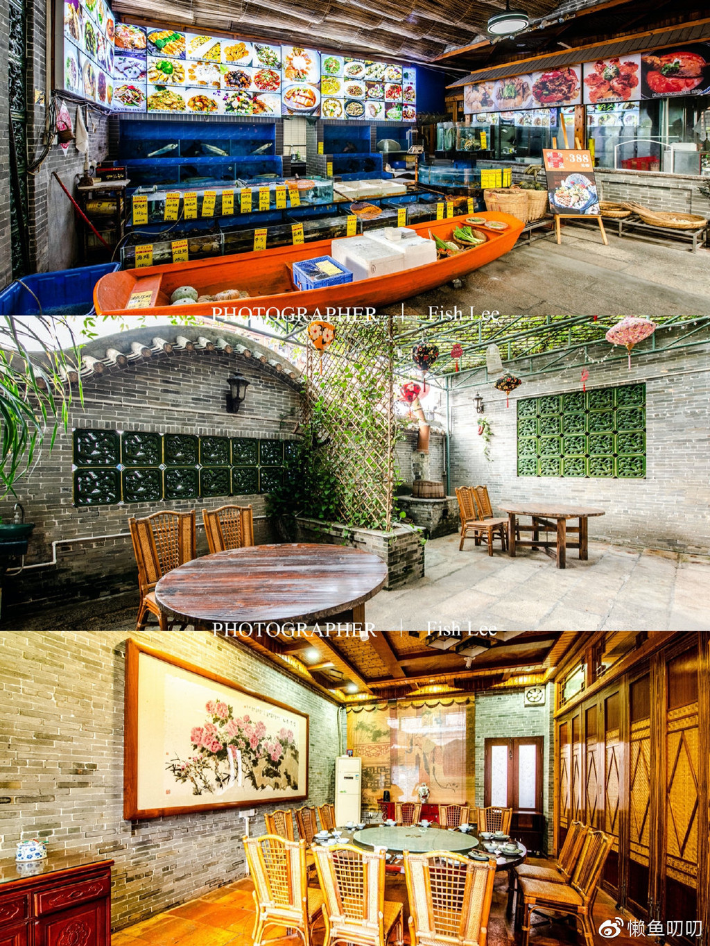 自极具广东特色的趟栊门迈入店里,好像就进入了本地大宅,客厅已然非常气派,但还不是食客们的最终归宿!穿过客厅,路过生猛海鲜池,点好时鲜的游水美味,店员这才引大家去往提前预定好的座位落座(这里也最好提前预定,我们去到的时候,很多餐位都已经被订出去了)。在从大门到座位的过程里,精致的建筑、清雅的庭院在近黄昏的光景里更显韵味。落座没多久,我们点的佳肴便鱼贯而上,这效率也是妥妥的!接下来便跟大家分享几道我喜欢的美味!