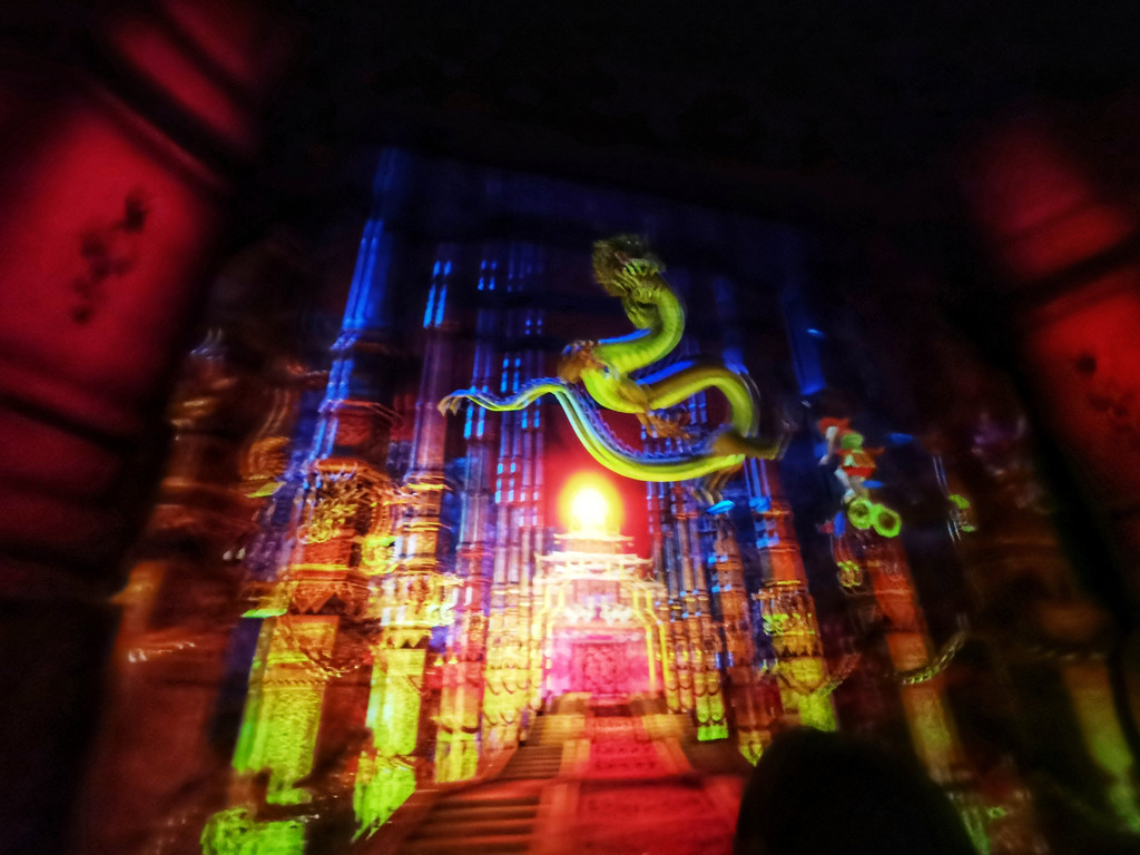 《水漫金山》:里面超级凉爽!玩一圈下来发现方特独家的这种主题项目都好大,哈哈哈哈,一个项目就是一座庭院的感觉。这个项目尤其明显,进门后会走过长长的廊道,坐上一艘大船后发现是在室内建了一个河道,只能说牛逼牛逼!河道两旁通过建筑布景和一些特效还原了《白蛇传》里的钱塘夜景,非常漂亮。